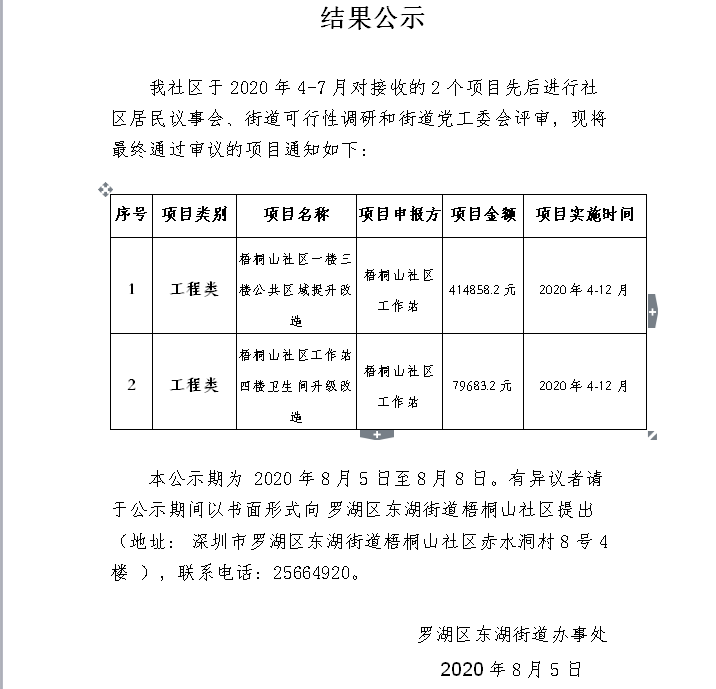罗湖区东湖街道梧桐山社区民生微实事结果公示