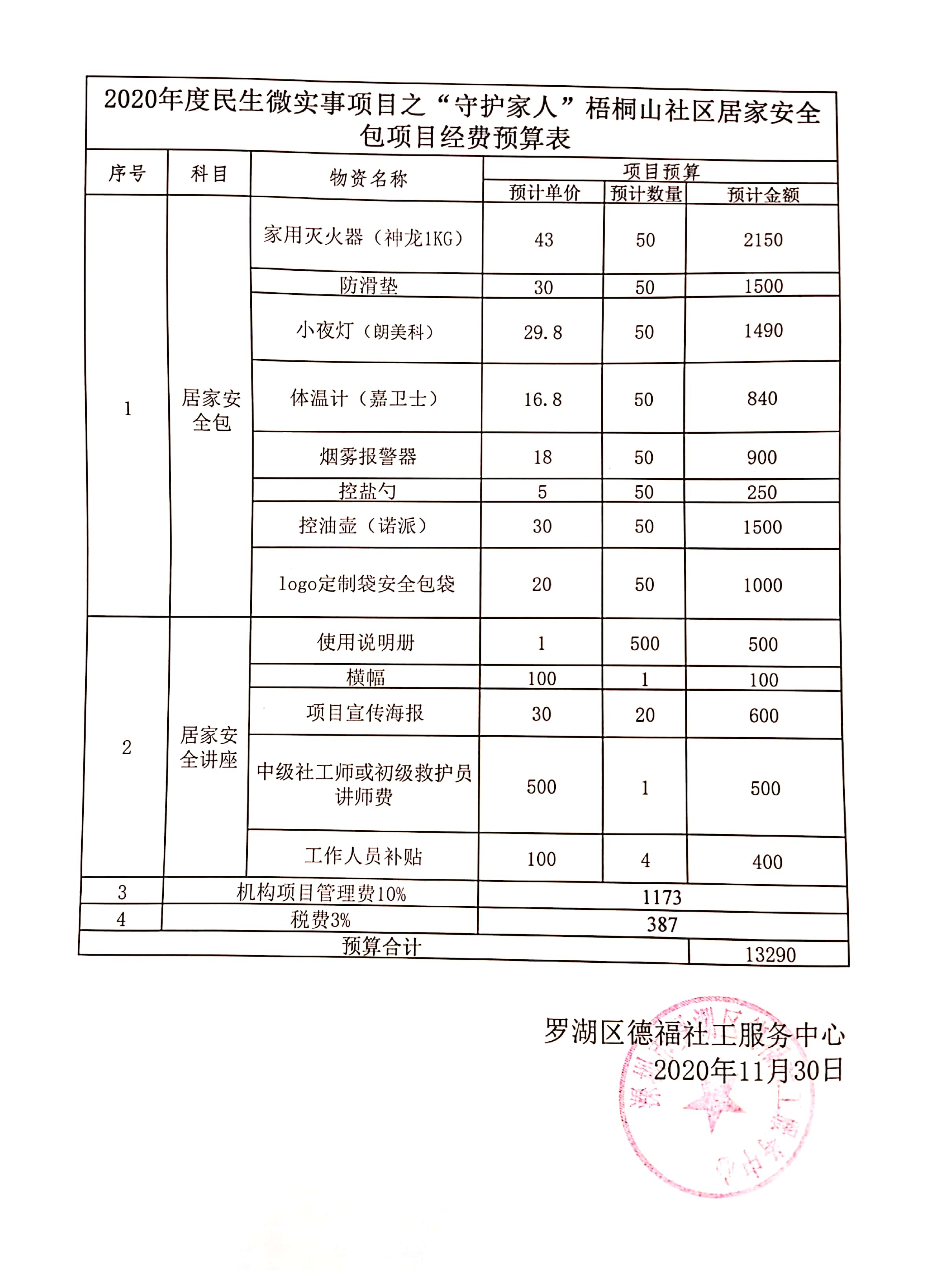 2020年民生微实事项目之“守护家人”梧桐山社区居家安全包项目经费预算统计表