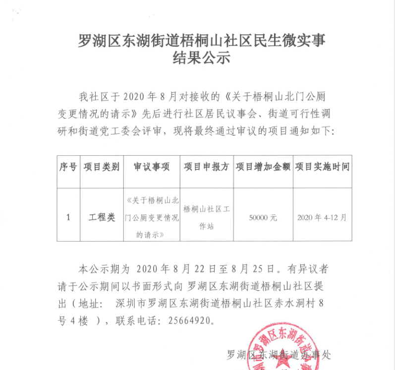 罗湖区东湖街道梧桐山社区民生微实事结果公示