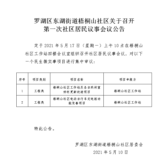 罗湖区东湖街道梧桐山社区关于召开第一次社区居民议事会议公告
