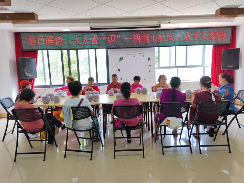 为进一步丰富社区居民的业余文化生活,提高老年人的动手能力,11月4日,在梧桐山社区党委的大力支持下,梧桐山社区党群服务中心、梧桐山社区新时代文明实践站联合在梧桐山社区党群服务中心三楼多功能室开展了冬日暖情,人人皆“织”-梧桐山社区长者手工活动,活动吸引了12位社区长者居民参与。