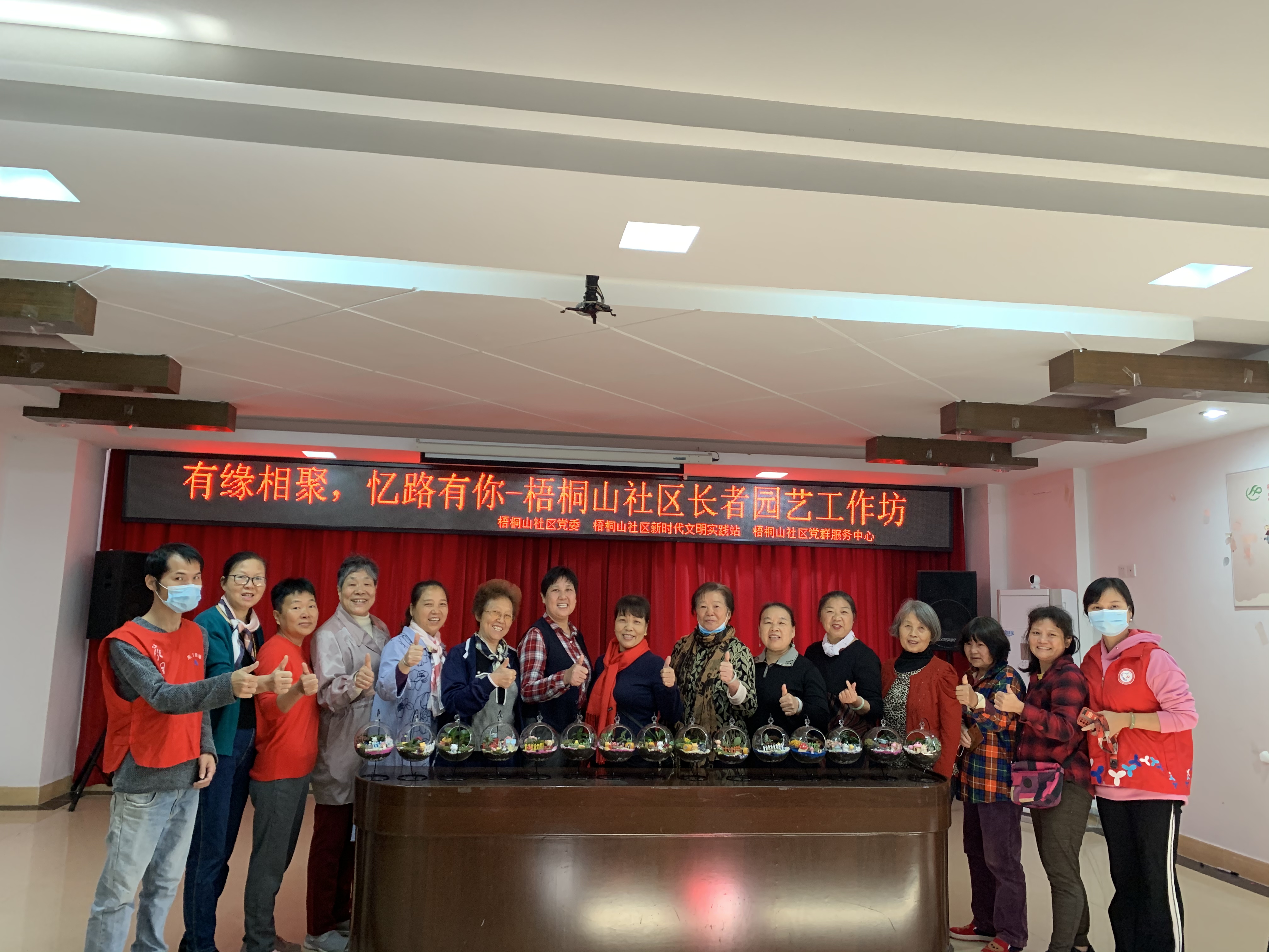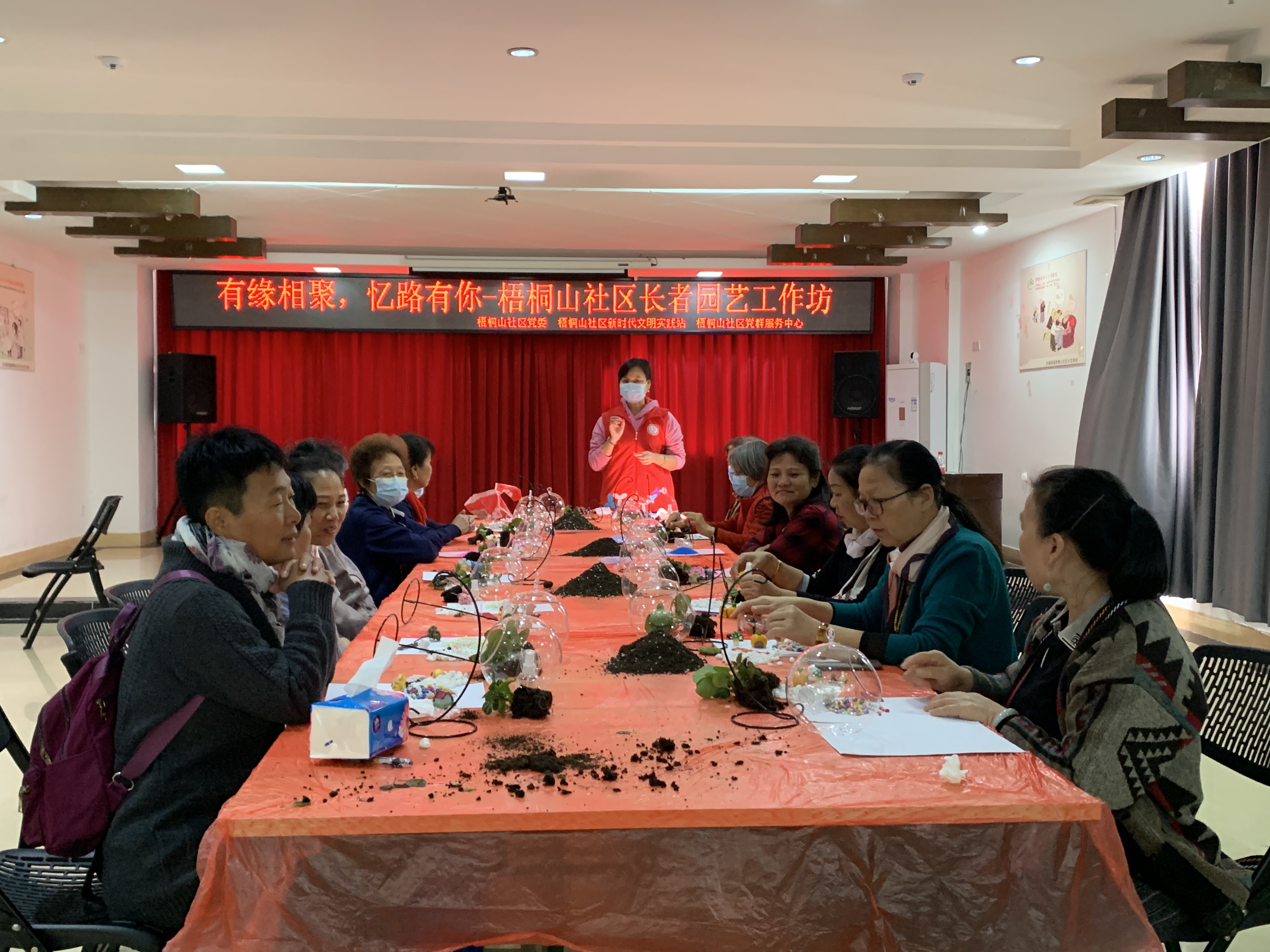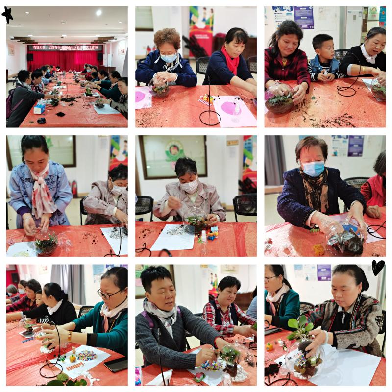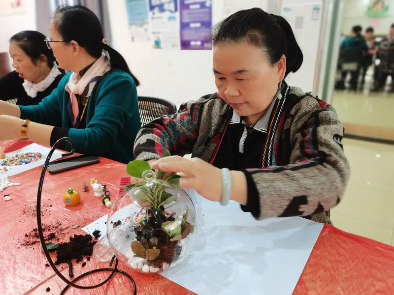 随着生活水平的提高,漂亮花卉和观赏植物成了居家摆设的新宠,相较于传统花卉占用面积大且需要较强的栽培技术,小型园艺产品新颖、小巧方便的特点吸引了更多人的关注。社工在平时开展活动中,了解到社区长者对植物种植有着浓厚兴趣,梧桐山社区新时代文明实践站、梧桐山社区党群服务中心在梧桐山社区党委的支持下,11月13日上午,在梧桐山社区党群服务中心多功能室开展“有缘相聚,忆路有你”-梧桐山社区长者园艺工作坊活动,本次园艺主要是微景观制作,吸引了社区15名长者到场参加。