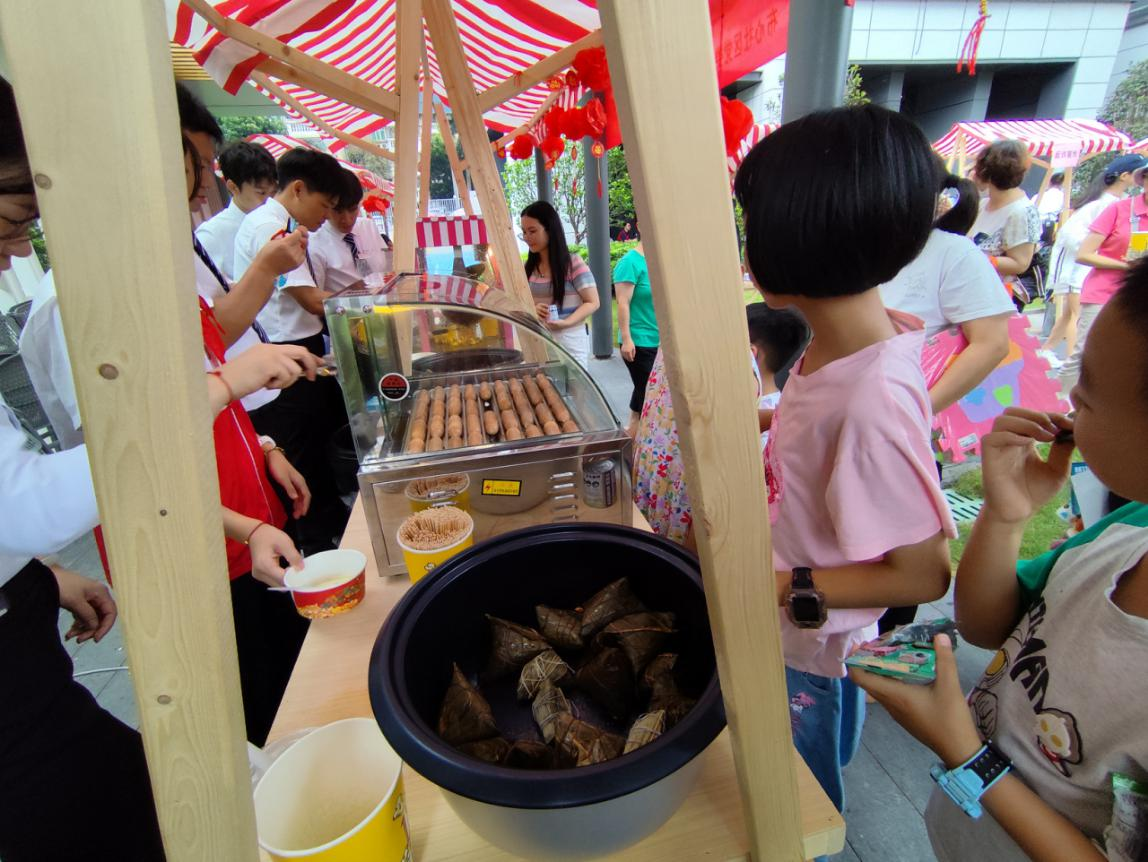 舌尖上的端午,当然少不了粽子和其他美食。绿色的粽叶、彩色的绳子,棱角分明、堆叠如小山般的粽子沉甸甸地挨挤着,散发出淡淡的草木香,诱惑着众人纷纷聚拢过来。粽叶的清香、糯米的温软、豆沙的甜润、咸蛋黄的醇厚...各种滋味在舌尖上绽放交融。爆米花和烤肠香气四溢,吸引着他们的味蕾,大家在这里品尝着美味的零食,享受着节日的惬意时光。美食不仅满足了大家的口腹之欲,也增添了活动的欢乐氛围。