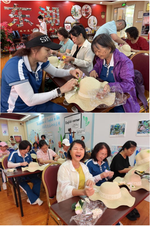 随后,活动进入“巧手生花·创意制作”环节。在社工的引导与协助下,长者们纷纷投入到干花草帽的手工创作中。现场准备了各式干花、丝带、草帽及其他制作工具,大家兴致勃勃地挑选心仪花材,认真构图、细心粘贴,将原本朴素的草帽装点成一件件独具匠心的艺术品。有的作品典雅大方,有的则色彩明快、充满活力,每一顶草帽都凝聚了长者们的巧思与对生活的热爱。制作过程中,大家互相交流心得、分享配色技巧,欢声笑语不断,邻里情谊在指尖流转中愈发深厚。