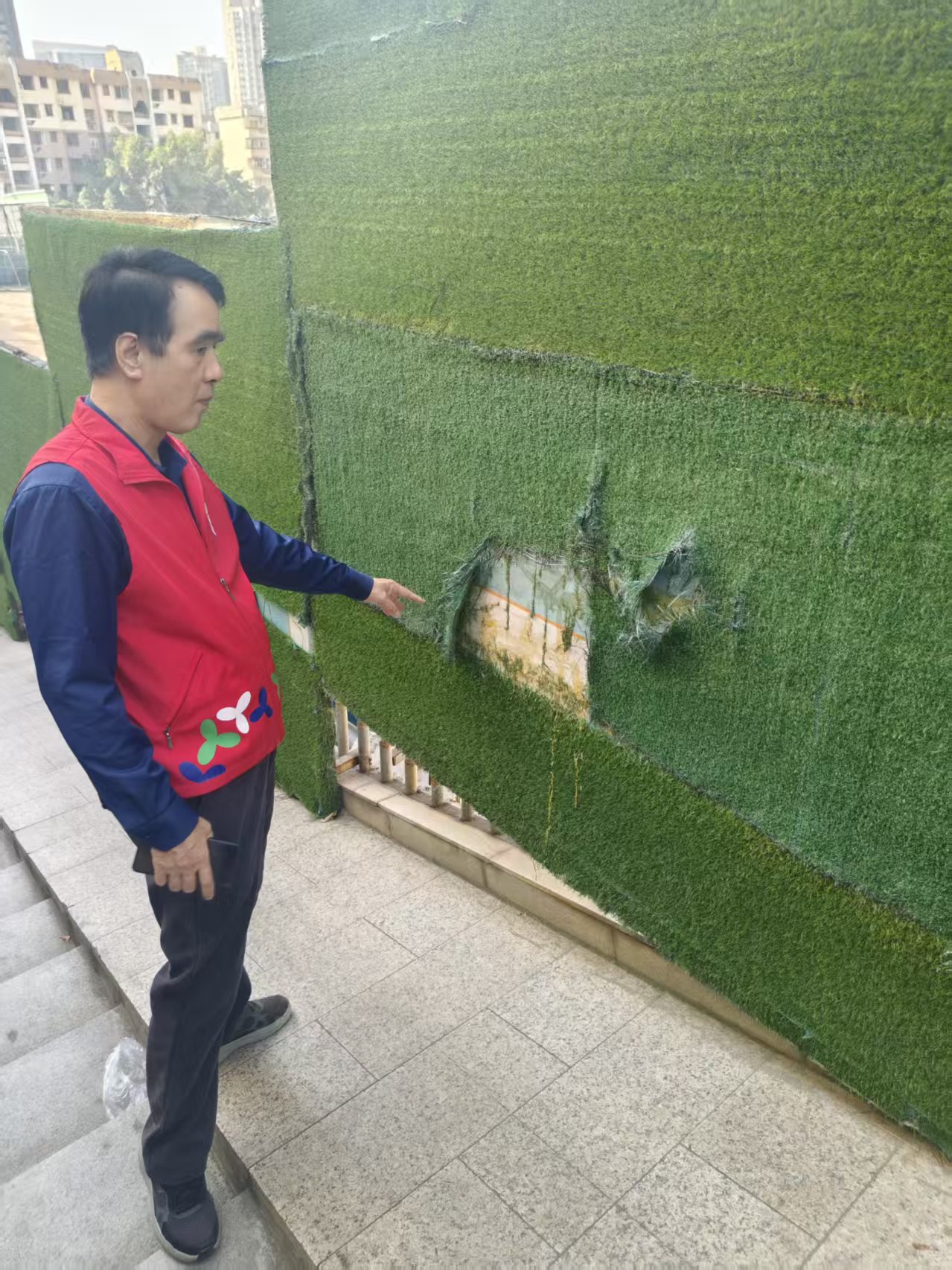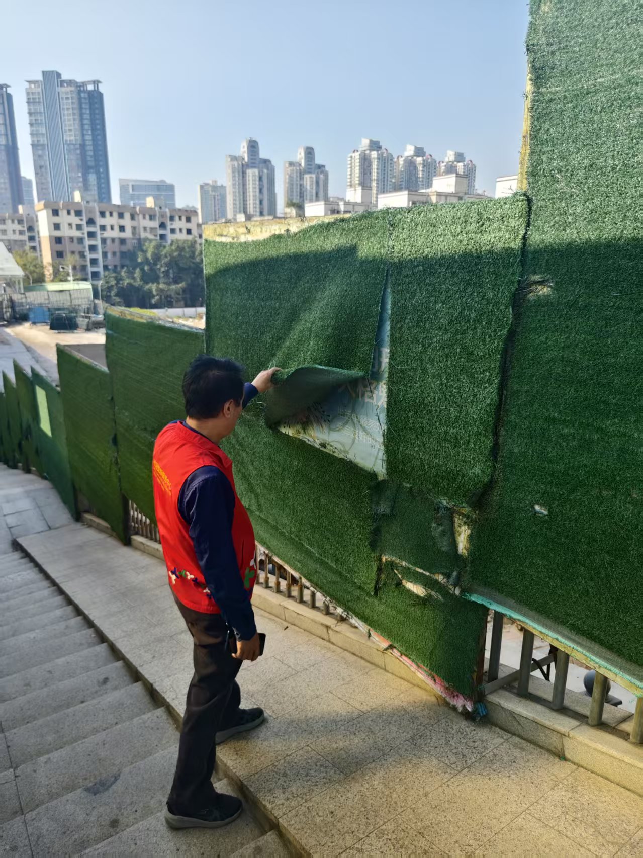 巡查过程中,重点查看了社区内各处的绿化围挡、公共道路及附属设施状况,工作人员对设立在路旁的仿真草皮围挡进行了仔细检查,观察其是否存在破损、固定不牢等情况,对巡查中发现的其他环境细节,也保持了高度关注,进一步提升了社区环境生活质量,保障居民生活安全。