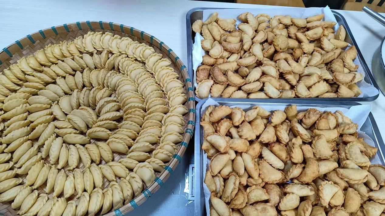 活动现场,面粉、花生、芝麻、鸡蛋、椰蓉、白糖等原料在桌上铺开,空气中交织着的香与甜,提前唤醒了年的记忆。活动特别邀请了精通油角制作的老师傅--赖阿姨、张阿姨等长者作为技艺指导。“油角要捏得像荷包,料要足,褶子要深要细,寓意锁住福气、家宅兴旺!”赖阿姨一边演示,一边用亲切的本地客家话讲解着油角的吉祥寓意。志愿者及骨干围坐在一起,和面、调馅、擀面、压模、包馅、锁边。年轻一辈虚心求教,长者们倾囊相授,手中传承的是技艺,口中讲述的是过去布心村民一起准备年货的热闹记忆。