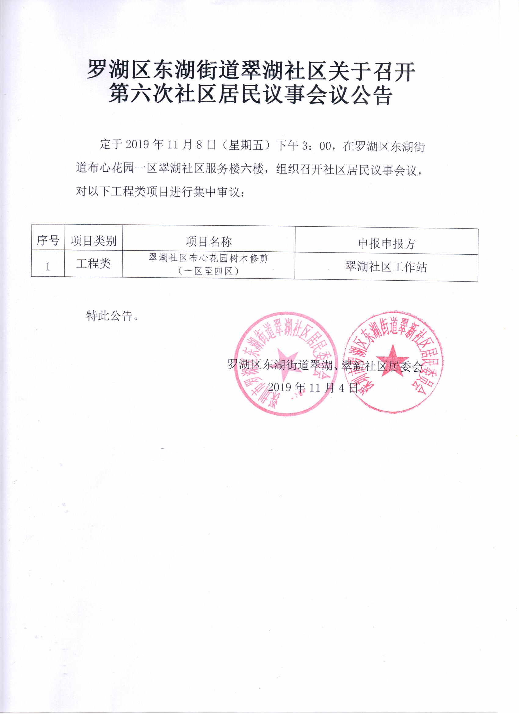 东湖街道翠湖社区关于召开第六次社区居民议事会议公告