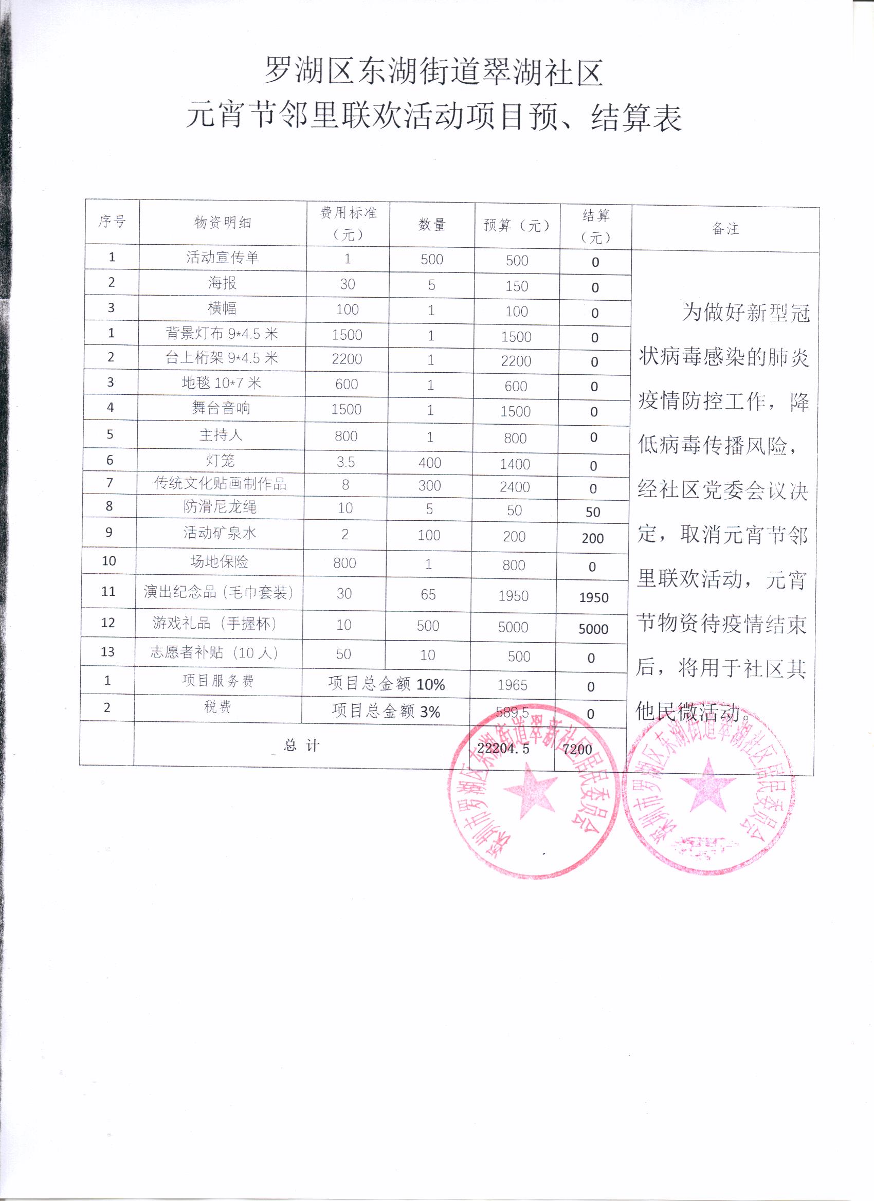 东湖街道翠湖社区“元宵节邻里联欢活动”项目预、结算表公示