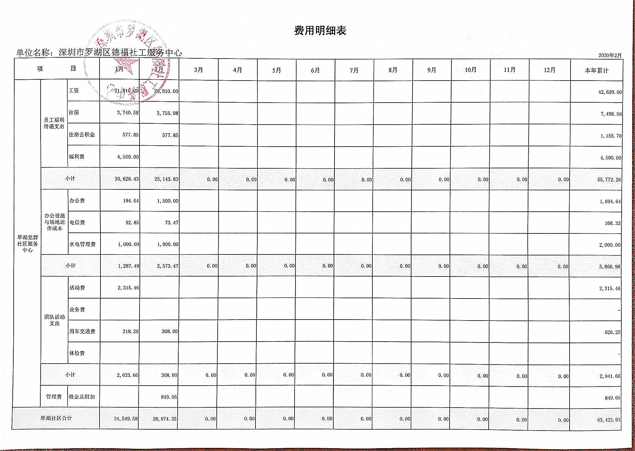 深圳市罗湖区德福社工服务中心二月份财务公示(驻东湖街道翠湖社区党群服务中心)