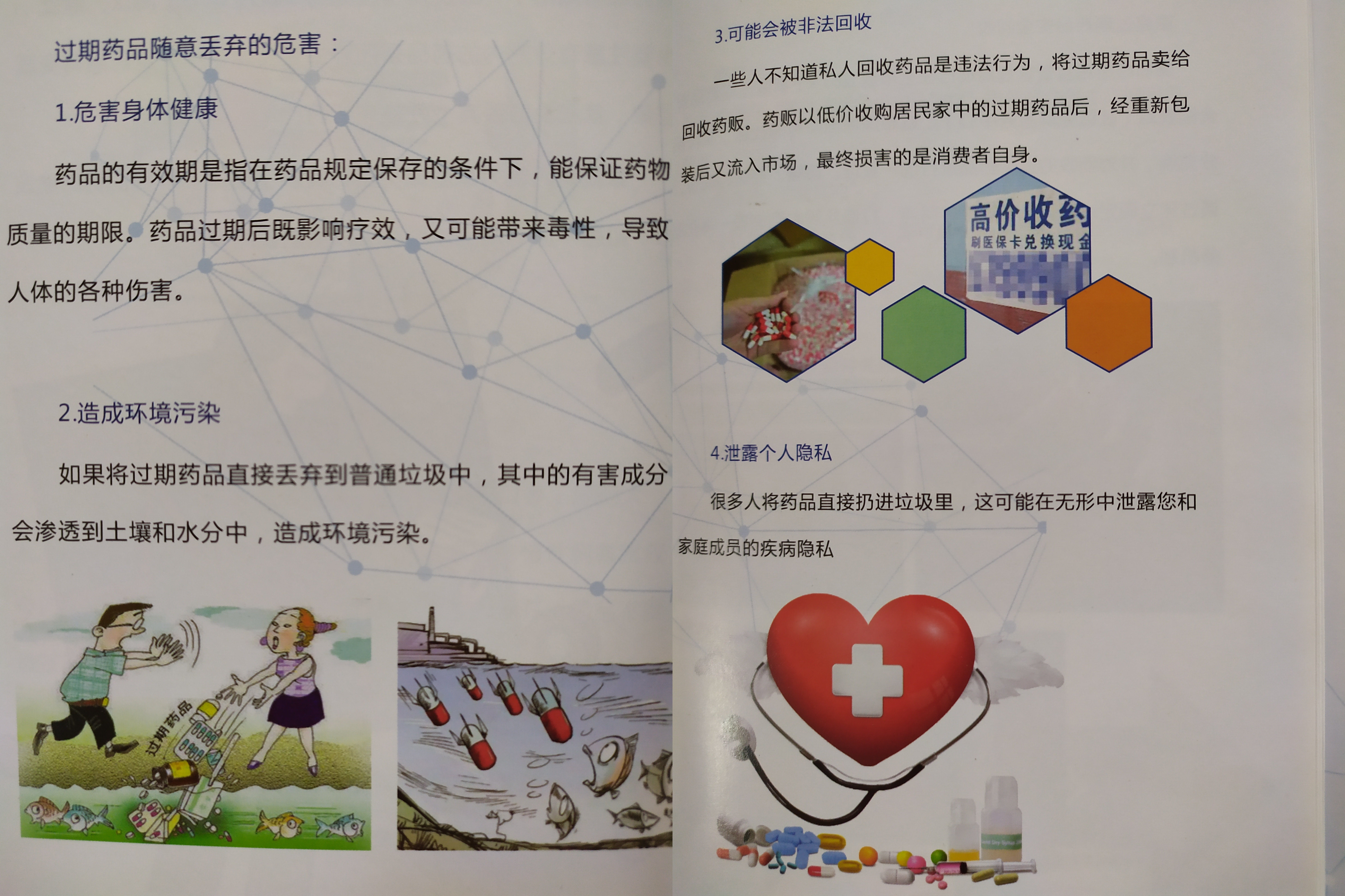 1、过期药品回收(过期、闲置不用的药品、中药原材料等),统一回收并进行销毁。