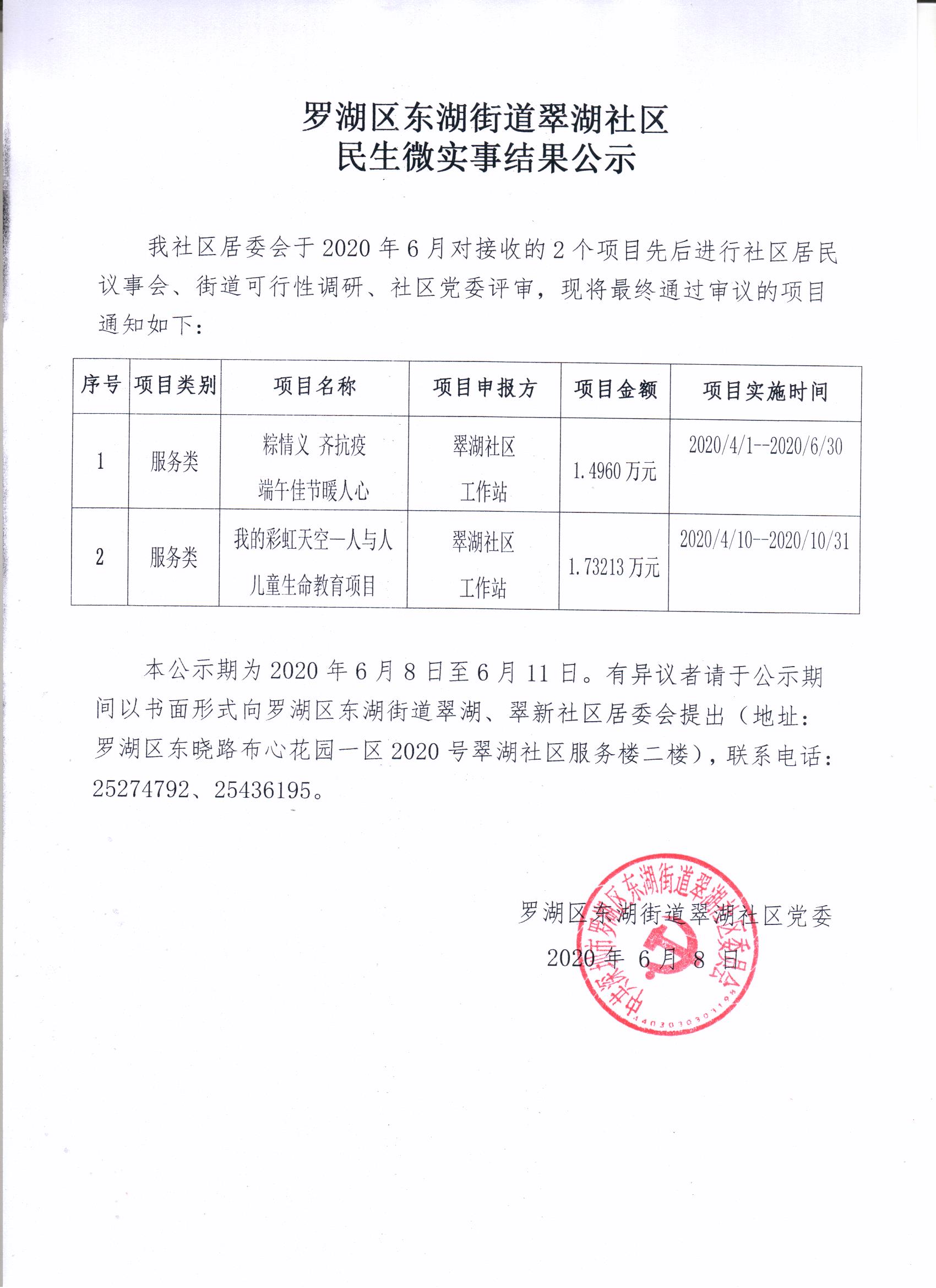 罗湖区东湖街道翠湖社区民生微实事结果公示