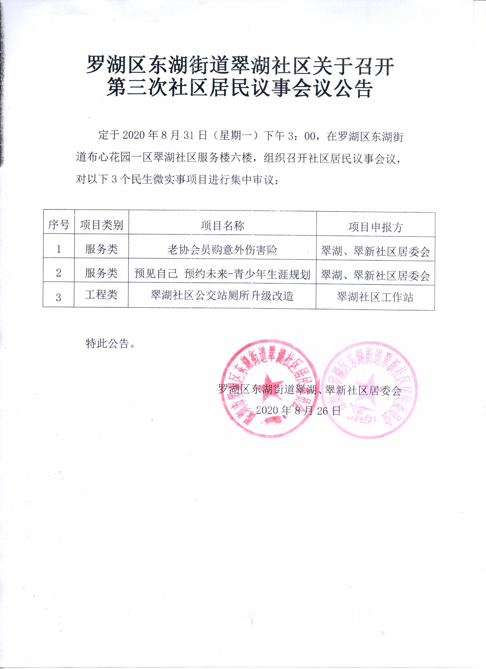 罗湖区东湖街道翠湖社区关于召开第三次社区居民议事会公告