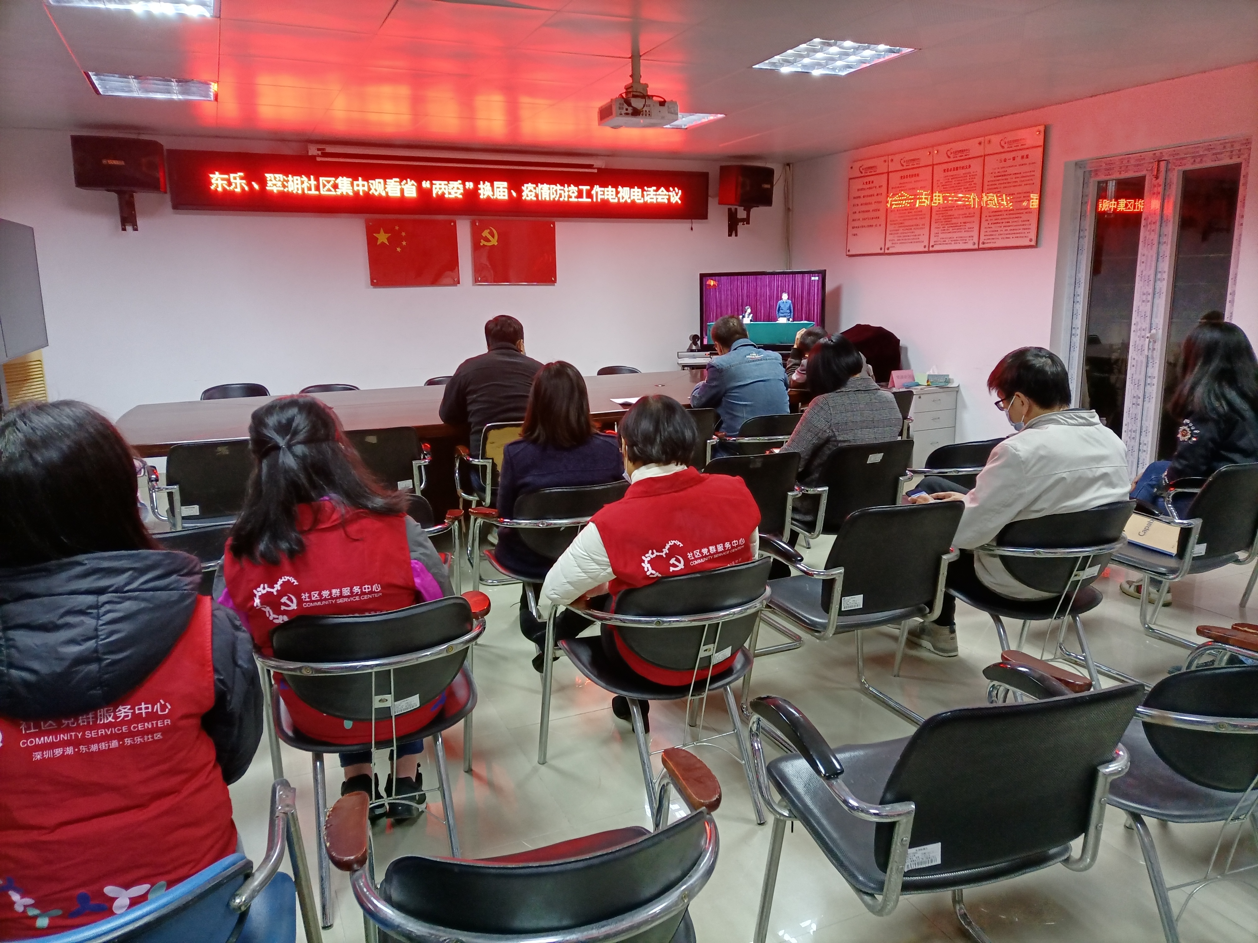 翠湖、东乐社区集中观看省两委换届、疫情防控工作电视电话会议