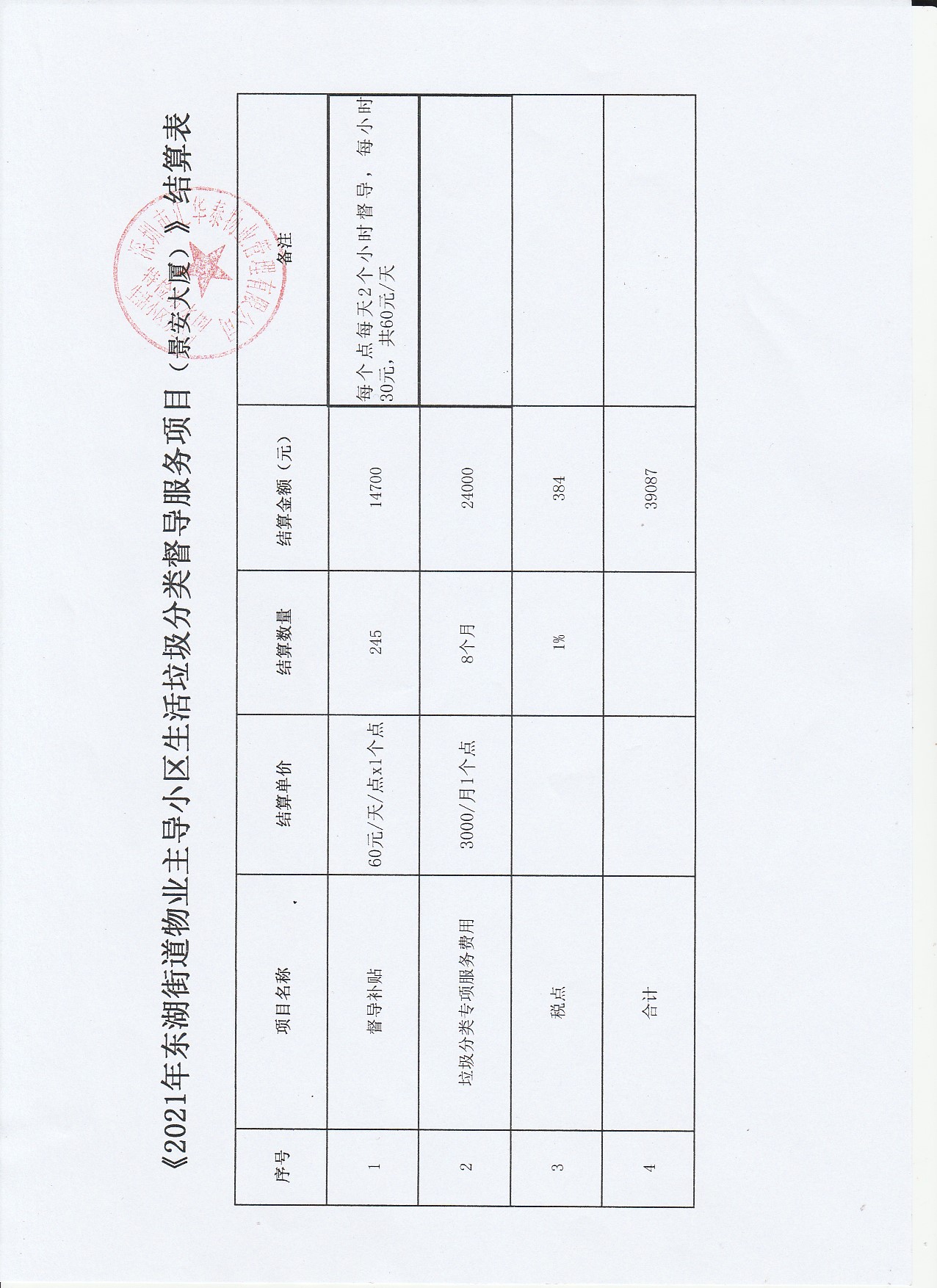 2021年东湖街道物业主导小区生活垃圾分类督导服务项目(景安大厦)结算表公示