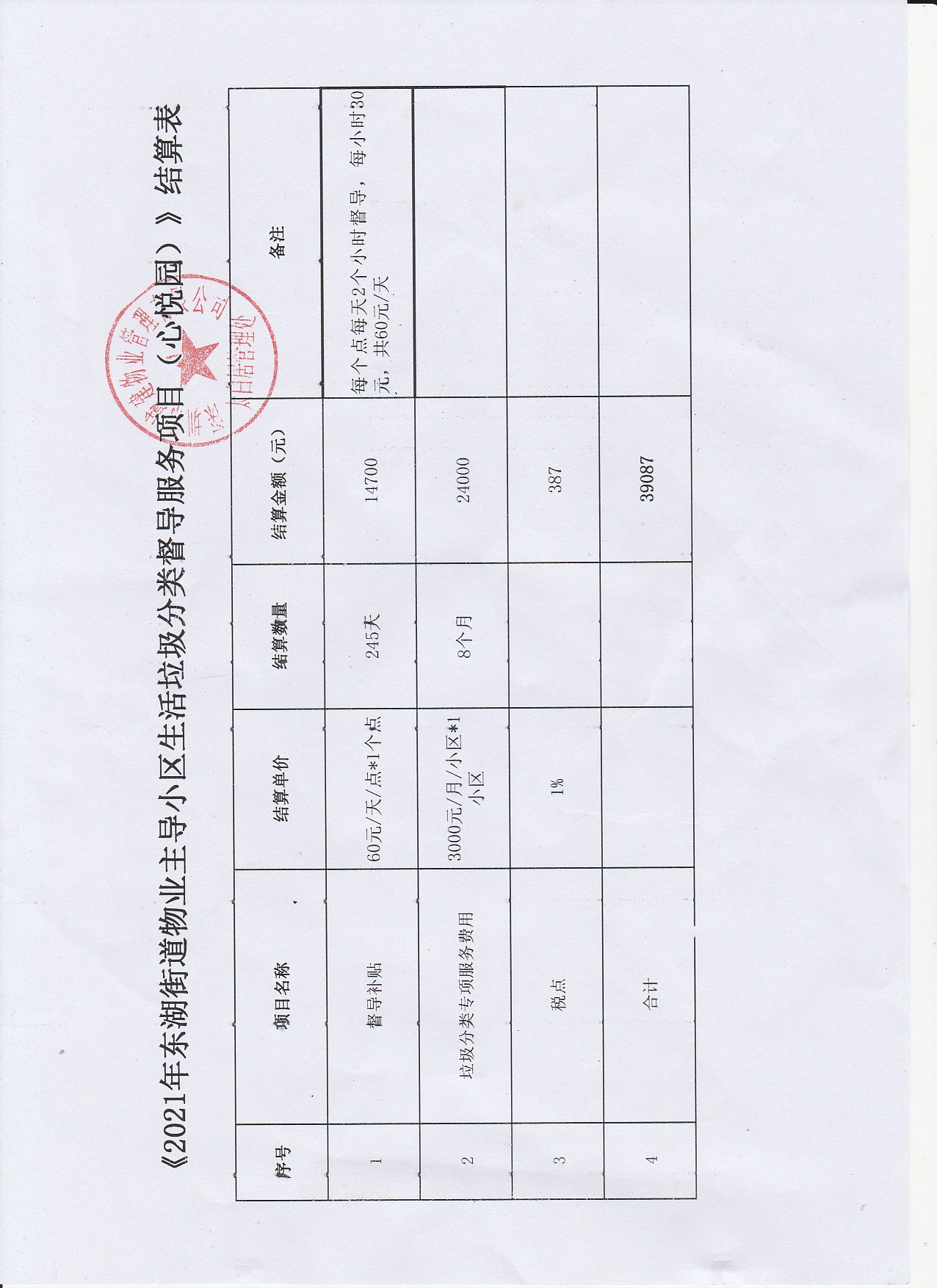 2021年东湖街道物业主导小区生活垃圾分类督导服务项目(心悦园)结算表公示
