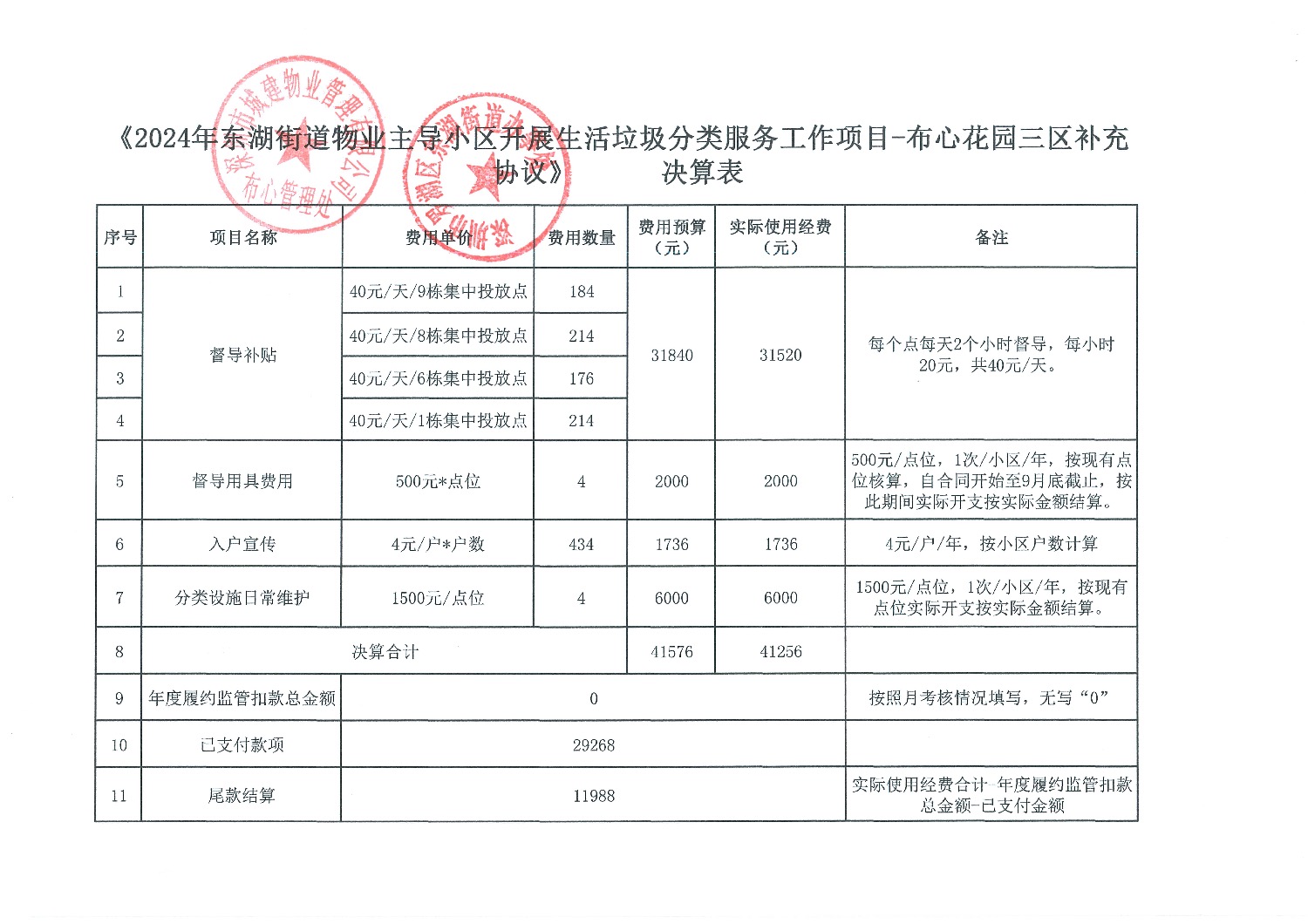 2024年东湖街道物业主导小区生活垃圾分类督导服务项目(布心花园三区)结算表
