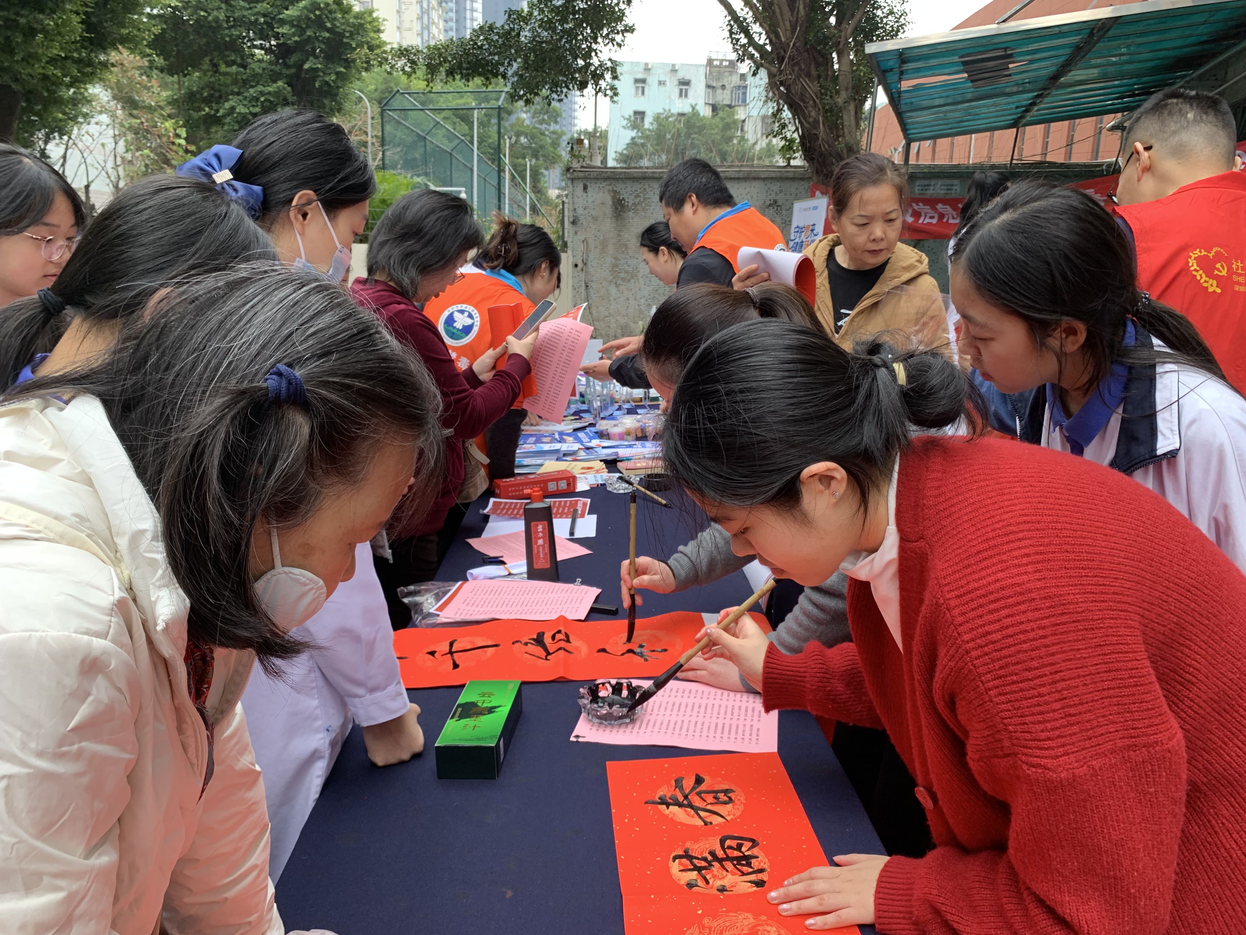 在活动中,社工一边协助书法老师,一边引导居民有序排队。现场还挖掘了几位擅长书法的居民,纷纷加入写春联的志愿者队伍。只见他们铺展红纸、饱蘸浓墨,挥毫泼墨间,一副副笔力遒劲、寓意吉祥的春联和“福”字跃然纸上,所写内容既贴合2026马年生肖,又饱含对新年的美好期盼;其他志愿者也没闲着,有的为居民挑选,有的讲解春联寓意,还贴心地将写好的春联摆放晾干,方便居民领取。