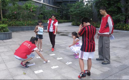 社工为孩子们在小区设置了四个关卡,并为四组成员分别安排了一名义工全程跟随保证孩子们的路上安全。关卡“快问快答站”和“逃离跳跳谷”孩子们需分别完成“两人三足”“跳绳20次”游戏后进行安全知识问答,方能通过关卡。关卡“快来帮帮我”,孩子们需寻找陌生人并向该陌生人提问,这个关卡让孩子学会安全知识的同时,学会在遇到自己无力解决的事时寻求帮助。关卡“我指挥你行动”让孩子们亲身体验,遇到地震、传染病、落水、火灾时,怎么自救。过程中,孩子们通力合作,运用智慧和勇气通过四个关卡,从而通过隐藏关卡——“我们是团队,我们相亲相爱、和谐友好”。