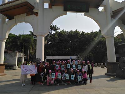 当天早晨,妇女朋友陆续来到东湖公园集合点,大家一齐戴上象征青春活力的粉红帽子在公园门口合影完成后,便开使徒步旅程。路上大家一边欣赏美景一边聊着家常,不时的停下脚步看看风景,等待走得慢的小伙伴们跟上队伍后再一起重新出发。1小时后队伍到达预定的终点——揽胜亭。这里风景宜人,能够看见整个水库的全景,走累了的女士坐下来休息聊天分享小零食,并拍照留下这美好的时刻。
