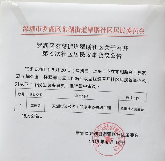 罗湖区东湖街道翠鹏社区关于召开 第4次社区居民议事会议公告