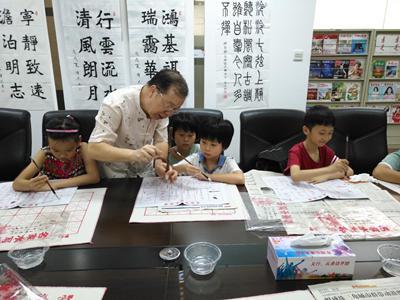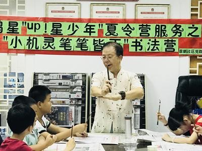 书法是中华民族优秀的传统文化,对于培养人的道德身心素质及良好的学习生活习惯有着非常重要的促进作用,为了丰富社区儿童的暑期文化生活,让孩子们度过一个充实,快乐而有意义的假期,7月27日,由翠鹏社区党群服务中心举办的鹏星“up!星少年”暑期夏令营服务之“小机灵笔笔皆正”书法营在彩世界家园图书室开启了第一堂课,活动邀请了刘老师为孩子们授课。