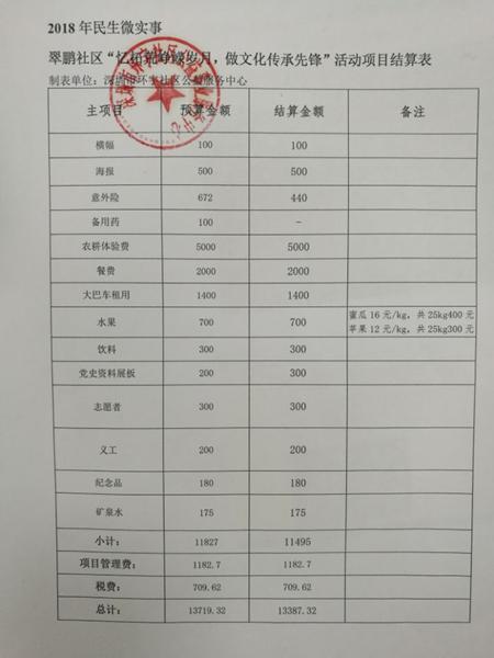 罗湖区东湖街道街道办事处 翠鹏社区民生微实事项目 翠鹏社区“忆拓荒峥嵘岁月,做文化传承先锋”活动项目结算表