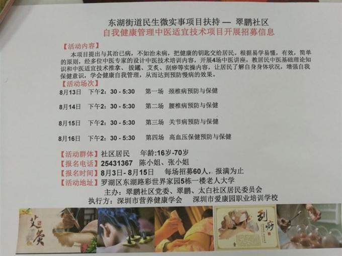 东湖街道民生微实事项目扶持-翠鹏社区自我健康管理中医适宜技术项目开展招募信息