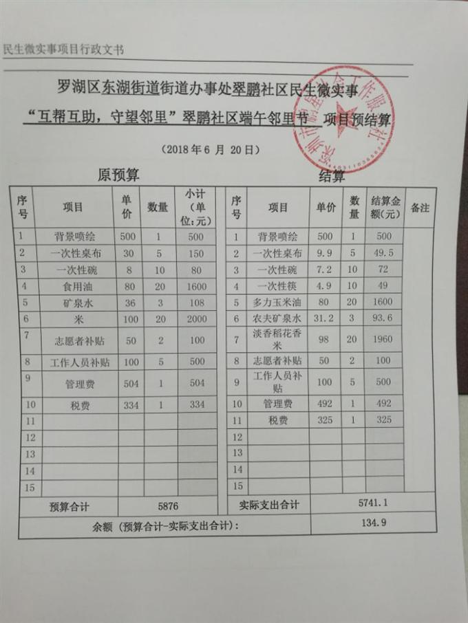 罗湖区东湖街道街道办事处翠鹏社区民生微实事项目“互帮互助,守望邻里”翠鹏社区端午邻里节项目预结算