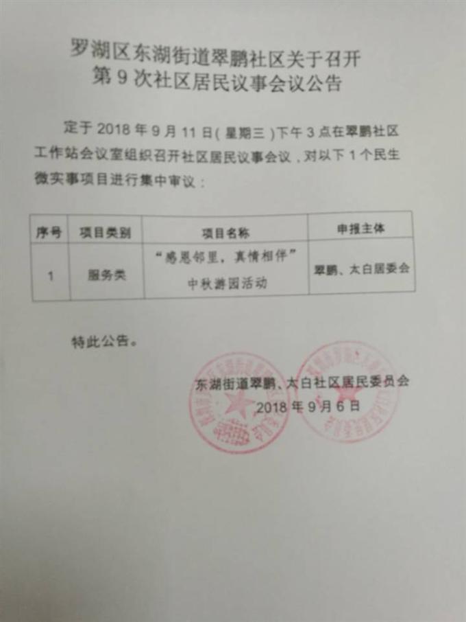 罗湖区东湖街道翠鹏社区关于召开 第9次社区居民议事会议公告