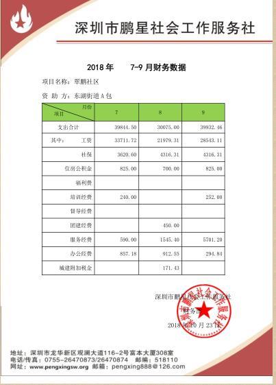 翠鹏社区党群服务中心2018年7-9月财务数据