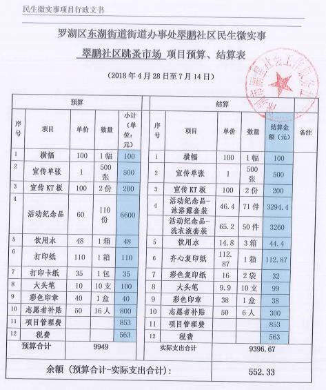 罗湖区东湖街道街道办事处翠鹏社区民生微实事翠鹏社区跳蚤市场项目预算、结算表