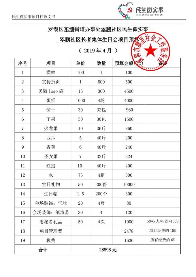 罗湖区东湖街道办事处翠鹏社区民生微实事翠鹏社区长者集体生日会项目预算