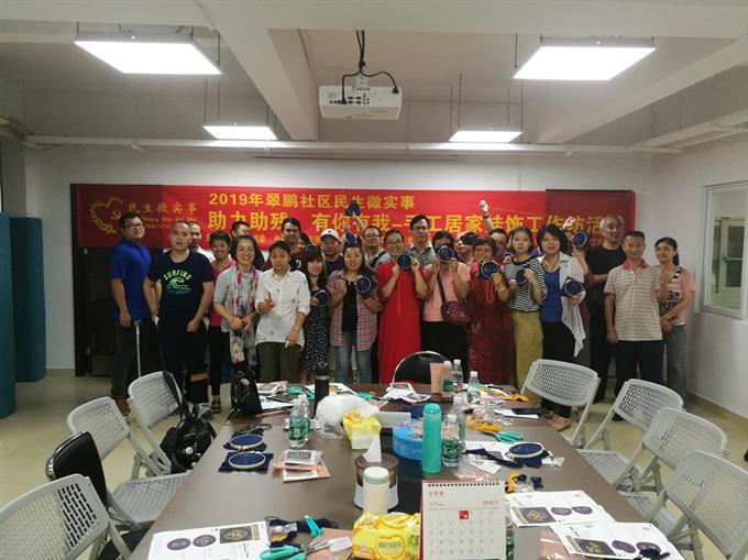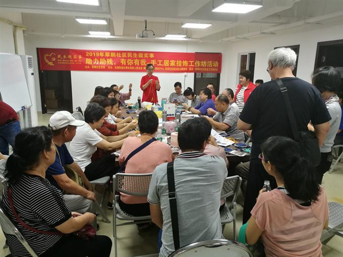 为丰富残障人士业余生活,提升他们首脑协调能力和交流能力,2019年5月22日上午,由翠鹏社区党委主办,东湖街道办事处残疾人联合会、翠鹏社区党群服务中心、深圳市东西方社工服务社协办,深圳市日月社会工作服务社承办的“助理助残,有你有我——残障人士手工居家挂饰制作”活动翠鹏社区大望苑3栋一楼职康中心活动室进行,约25名残障人士积极参与其中。