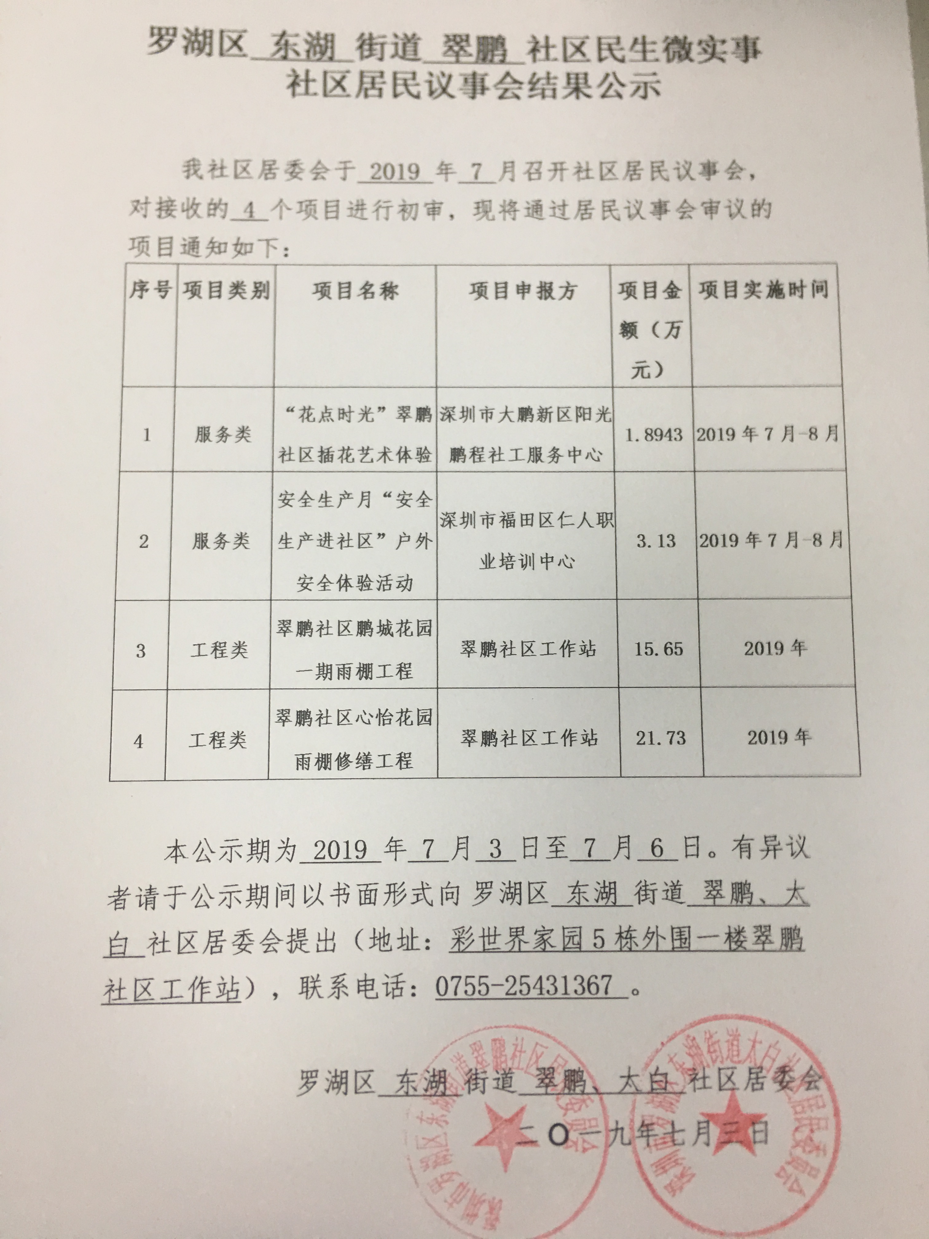 罗湖区东湖街道翠鹏社区民生微实事社区居民议事会结果公示