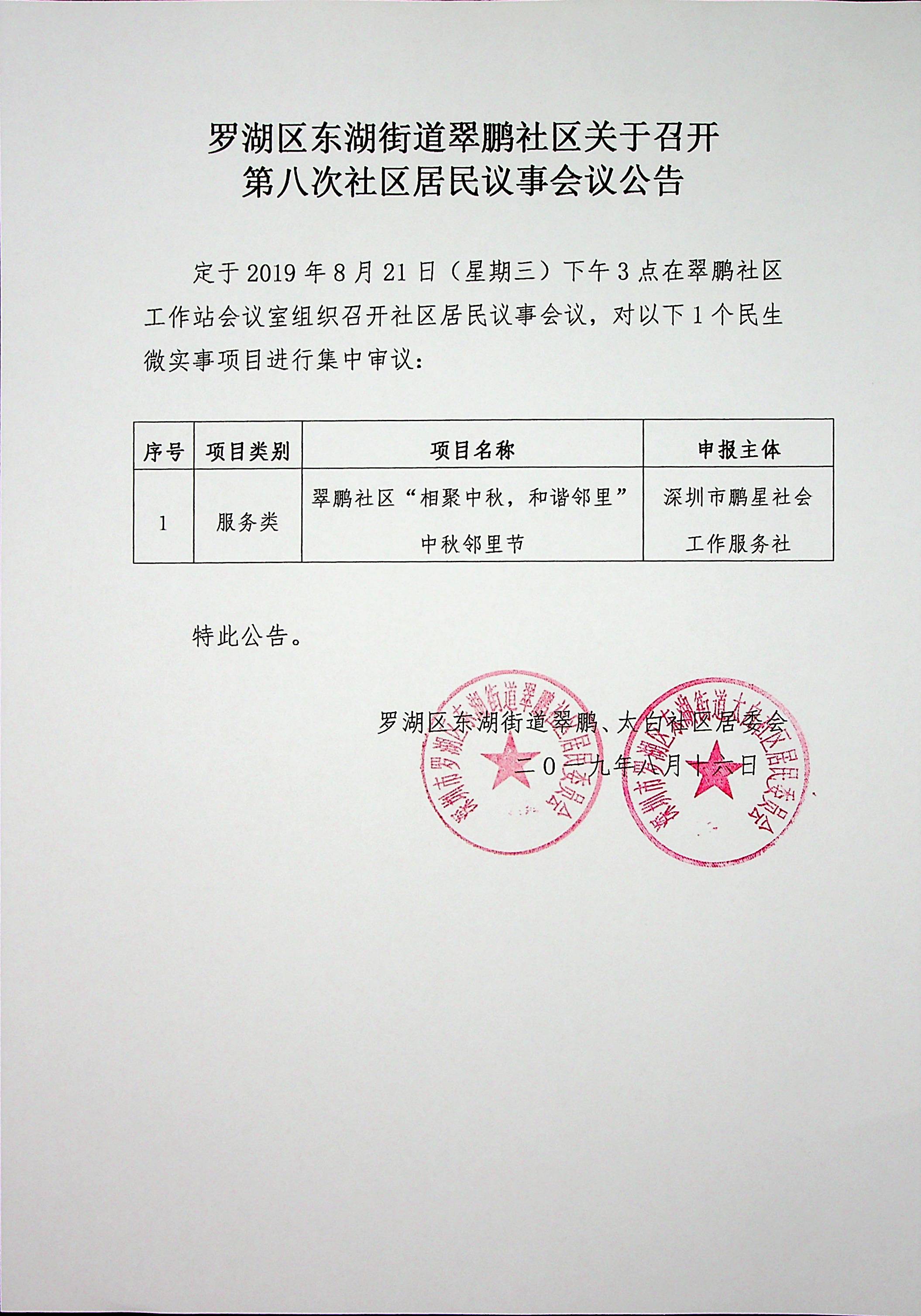 罗湖区东湖街道翠鹏社区关于召开第八次社区居民议事会议公告