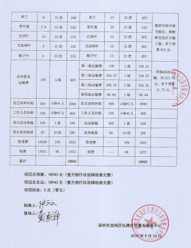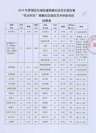 2019年罗湖区东湖街道翠鹏社区民生微实事“花点时光”翠鹏社区插花艺术体验项目结算表