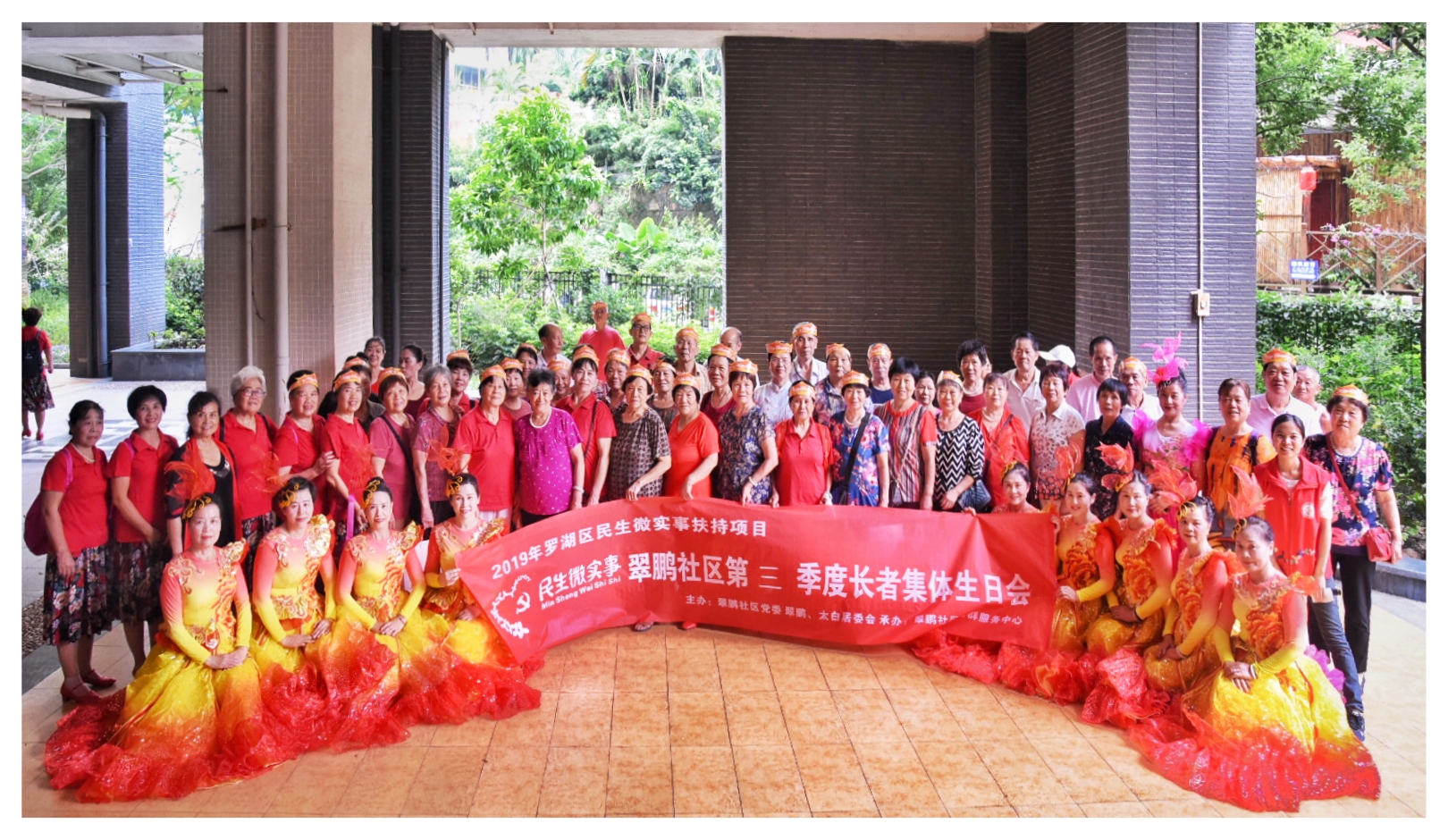 罗湖家园网讯:为丰富社区长者的精神文化生活,让他们感受到社区党委对长者们的关怀和照顾,2019年9月26日下午,在罗湖区民生微实事资金支持下,由翠鹏社区党委主办,翠鹏社区党群服务中心承办的翠鹏社区第三季度长者集体生日会在景亿山麒架空层内如期开展,现场共有50名长者参加。