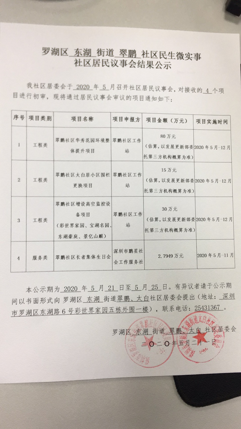 罗湖区东湖街道翠鹏社区民生微实事社区居民议事会结果公示