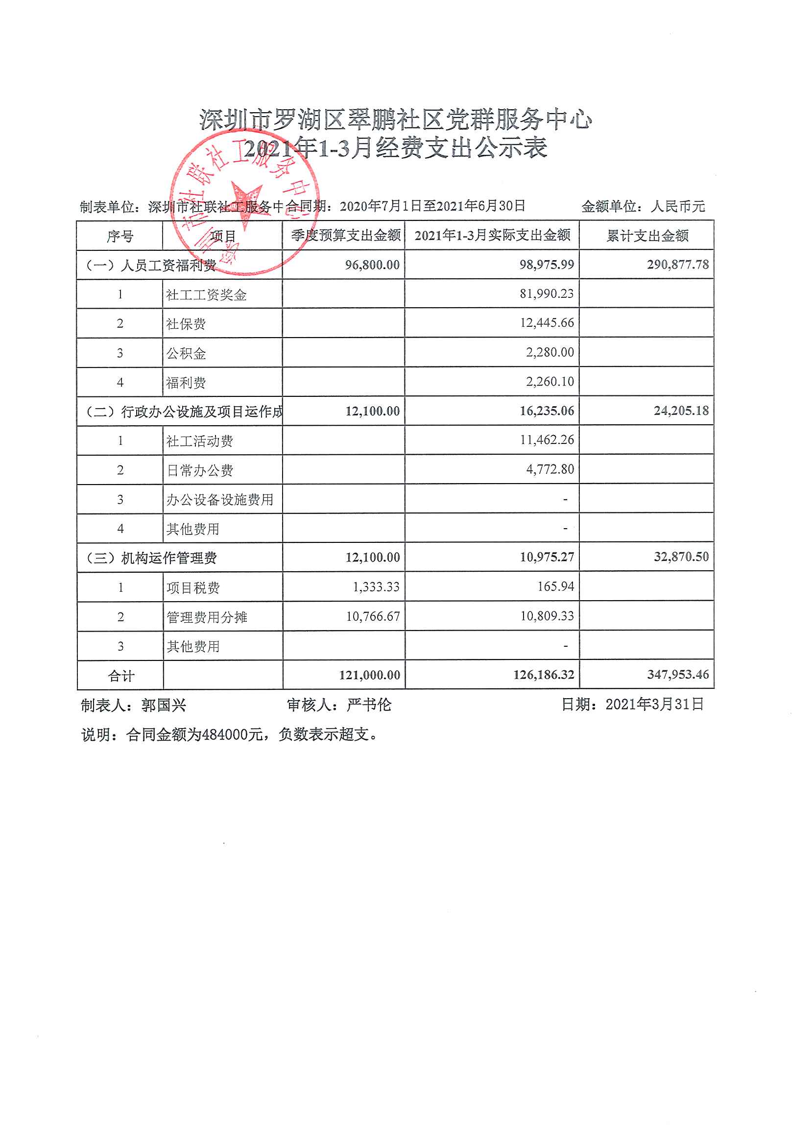 深圳市罗湖区翠鹏社区党群服务中心2021年1-3月经费支出公示表