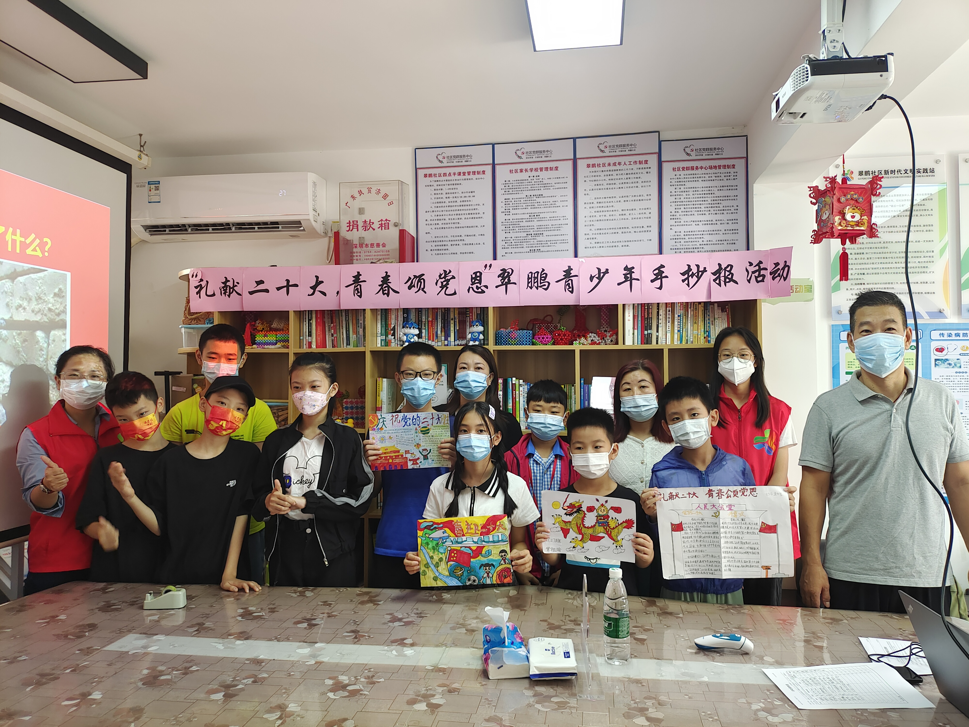 为了提升青少年儿童积极探索的欲望,激发青少年儿童的爱国热情,同时为了给社区青少年提供一个发挥创造力和提升社交能力的平台,10月27日-29日,在罗湖区东湖街道翠鹏社区党委的领导下,翠鹏社区新时代文明实践站依托翠鹏社区党群服务中心开展一场主题为“礼献二十大、青春颂党恩”青少年手抄报活动,活动通过线上+线下两种形式相结合循序进行,全程共吸引了15名社区青少年积极参加。