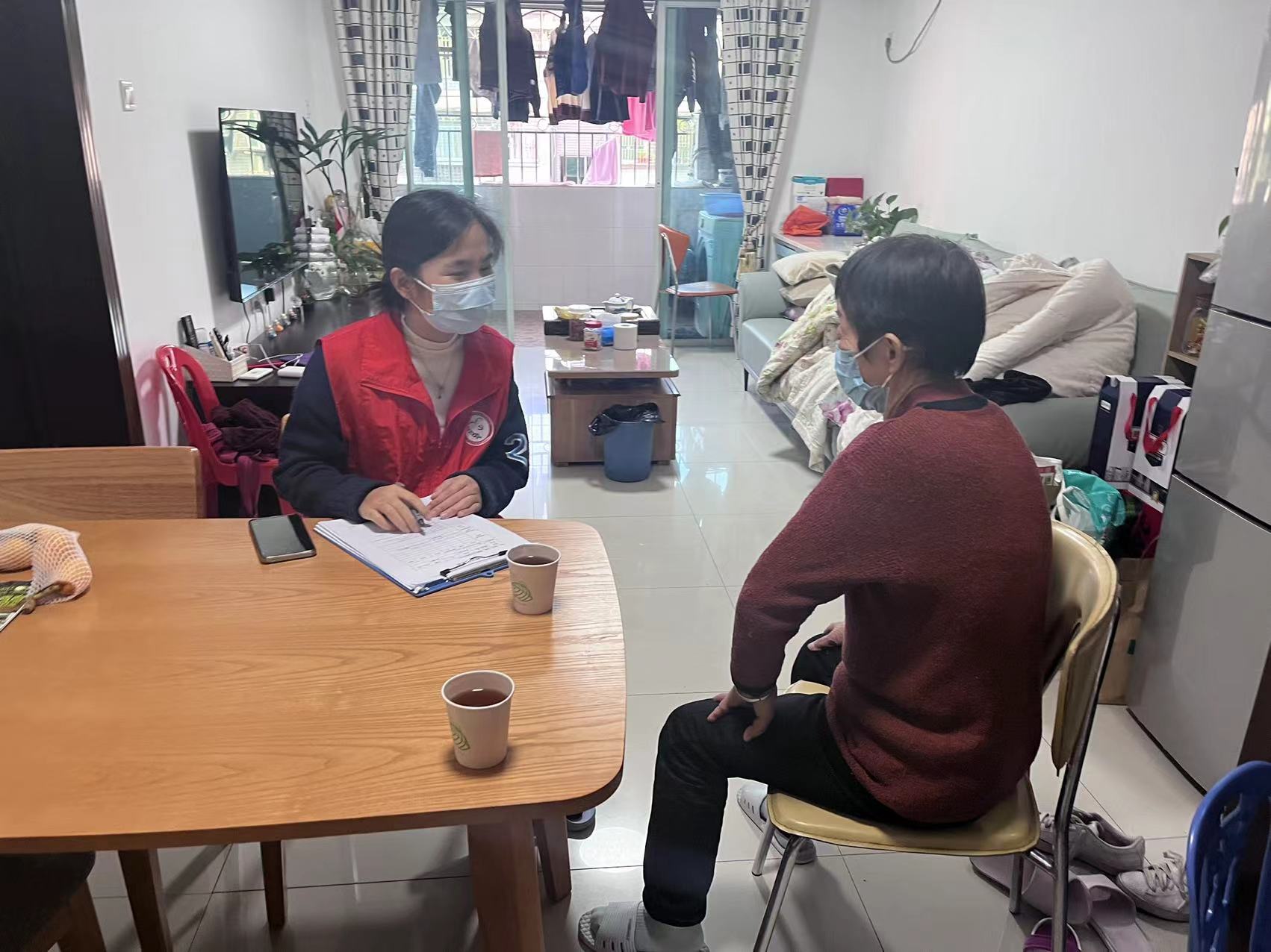 探访前社工先逐一致电长者,与长者们约定合适的上门时间。见到社工后,长者们一边担心麻烦到社工,一边对社工的到来非常开心,热情邀请社工进门入座。社工询问服务对象近期身体及生活状况,关心长者饮食睡眠、日常娱乐和交友互动等情况。长者们和社工聊起自己的儿女、过往以及如今的生活,其中有欢喜有辛酸也有苦楚,社工耐心倾听、积极回应,并认真记录长者的需求。长者们都非常感谢社工此次的探访,也感受到了社区的惦记和关心。