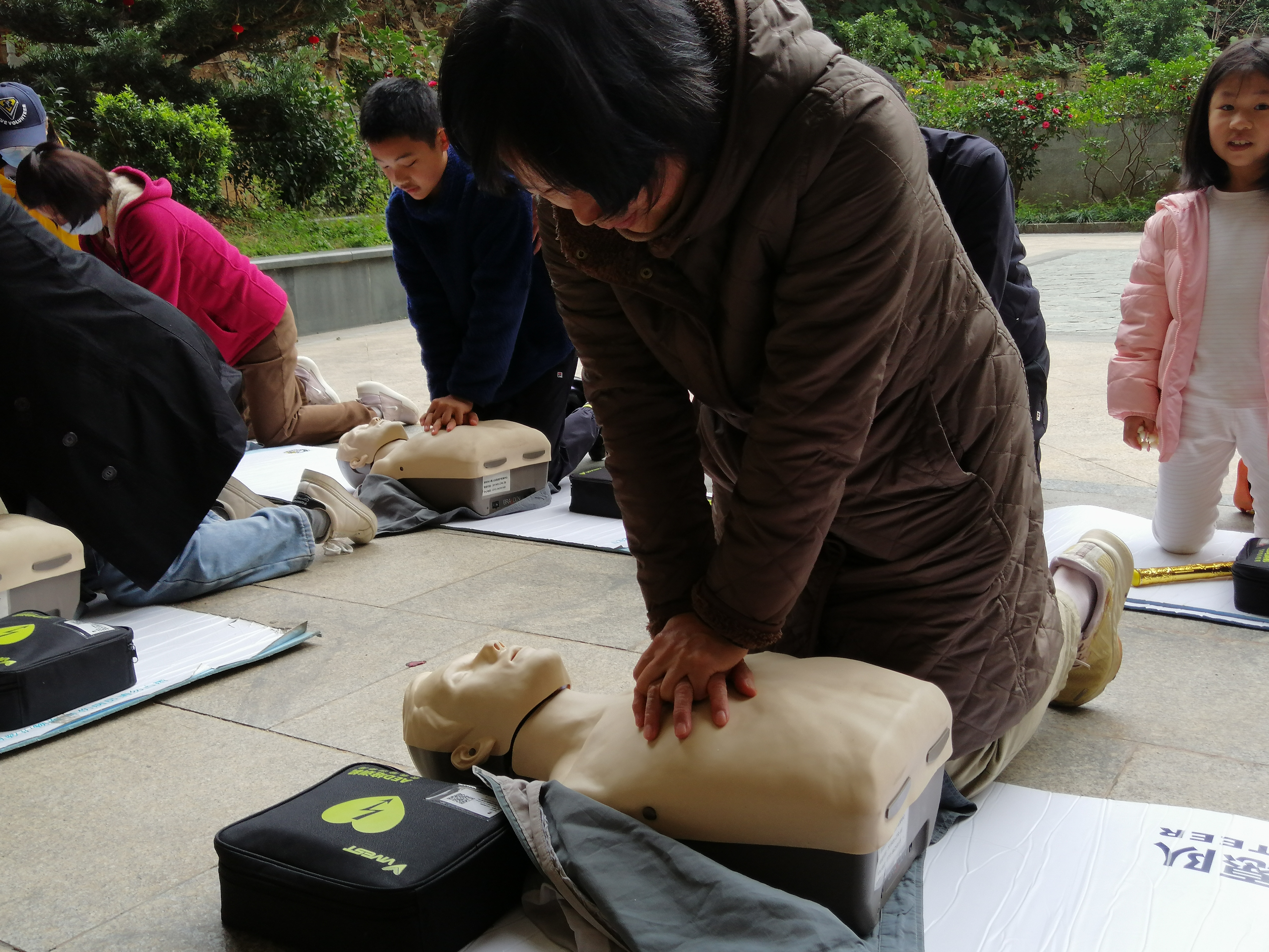 活动现场设置了婴儿和成人心肺复苏教学区、AED使用教学区、家庭急救综合知识教学区。以开放式的活动形式满足更多居民的学习需求,很多居民以家庭为单位参与到活动当中,走到楼下他们就可以轻松的学习到多种急救知识技能。在培训中,专业讲师采用理论讲述和现场实操演示的方式,对婴儿和成人心肺复苏全过程和AED的使用方法进行了详细地讲解后,邀请居民们就地实操演练,对于不规范不正确的手法和力度及时进行指导和修正,随后,讲师还向大家讲解了海姆立刻急救知识,告诉大家当发生异物卡喉时该如何的进行紧急救护或自救。本次室外普及满满的干货,极大的满足了时间不是很充裕的居民群体的参与需求。