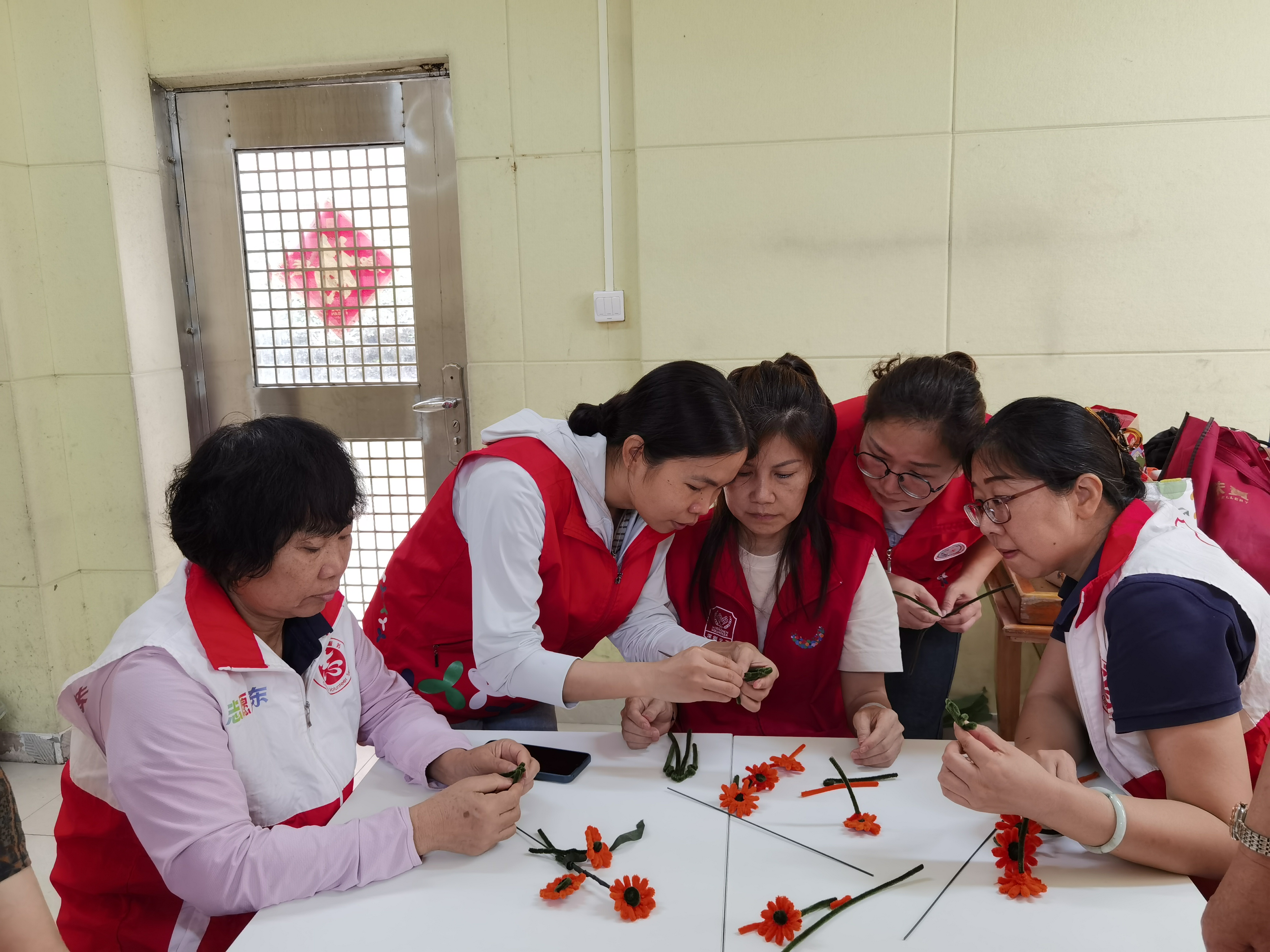 活动最后,以扭扭棒为媒介,社工通过现场示范的方式,带领志愿者制作花朵。一扭一捏,一卷一折,志愿者制作出一束相似又各具特色的雏菊。大家一边做手工,一边相互交流,现场气氛十分活跃。最后,大家将成品相互赠送,互道节日快乐,纷纷拍照留念,场面一片其乐融融。