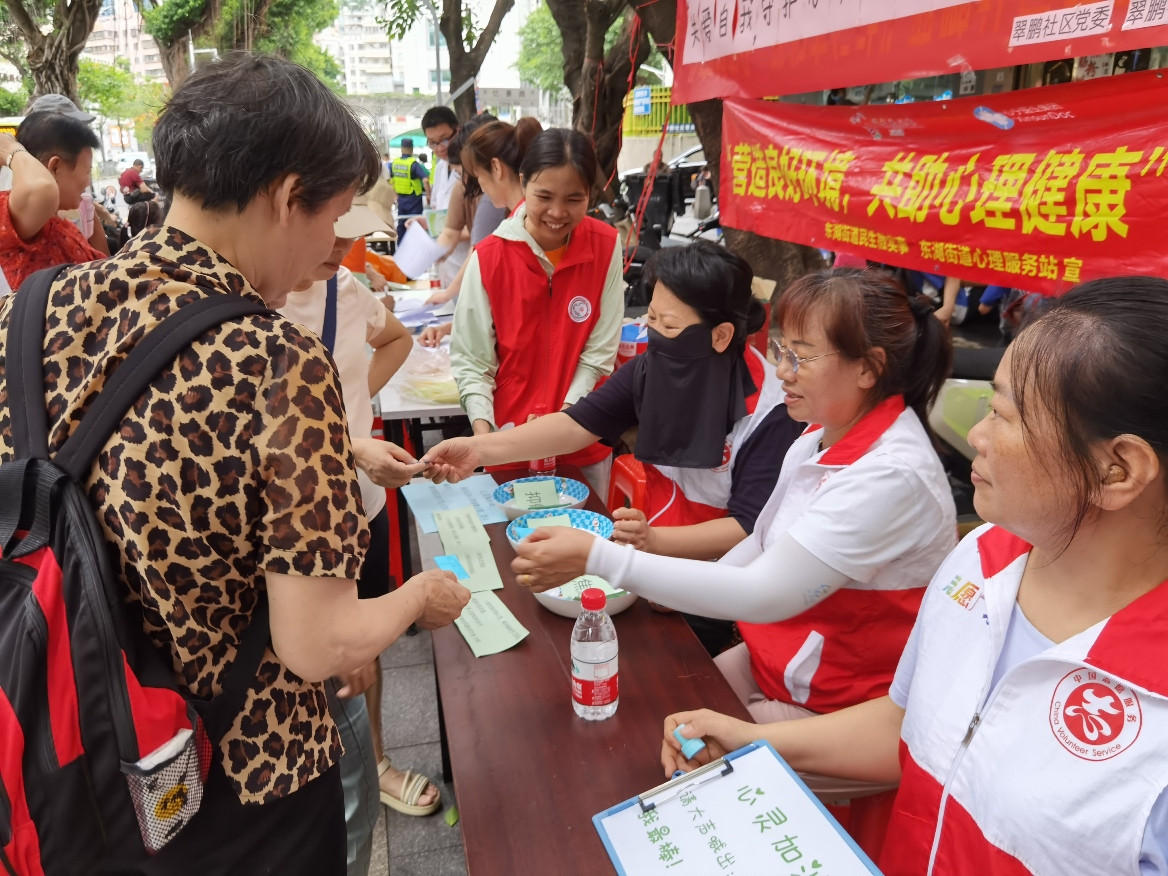 为积极响应《“十四五”国家老龄事业发展和养老服务体系规划》关于老年心理健康服务的号召,在翠鹏社区党委的指导下,翠鹏社区党群服务中心社工联合东湖街道心理咨询服务站咨询师、东晓社康服务中心医师以及翠鹏社区新时代文明实践站志愿者,于5月22日下午,以“关爱自我·守护银龄”为主题,开展了一场融合知识科普、心理疏导与社会倡导的心理健康关爱行动。活动现场设置了多个各具特色的摊位,运用生态系统理论构建“个人-社区-社会”三级支持网络,为社区长者提供多维度心理健康服务。