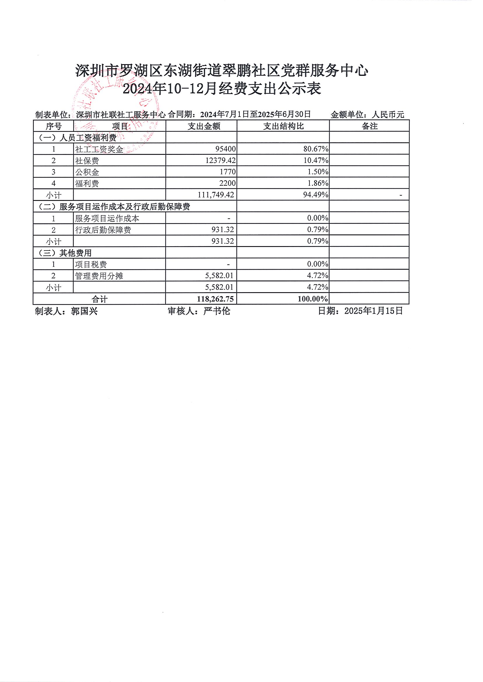 深圳市罗湖区东湖街道翠鹏社区党群服务中心2024年10-12月经费支出公示表