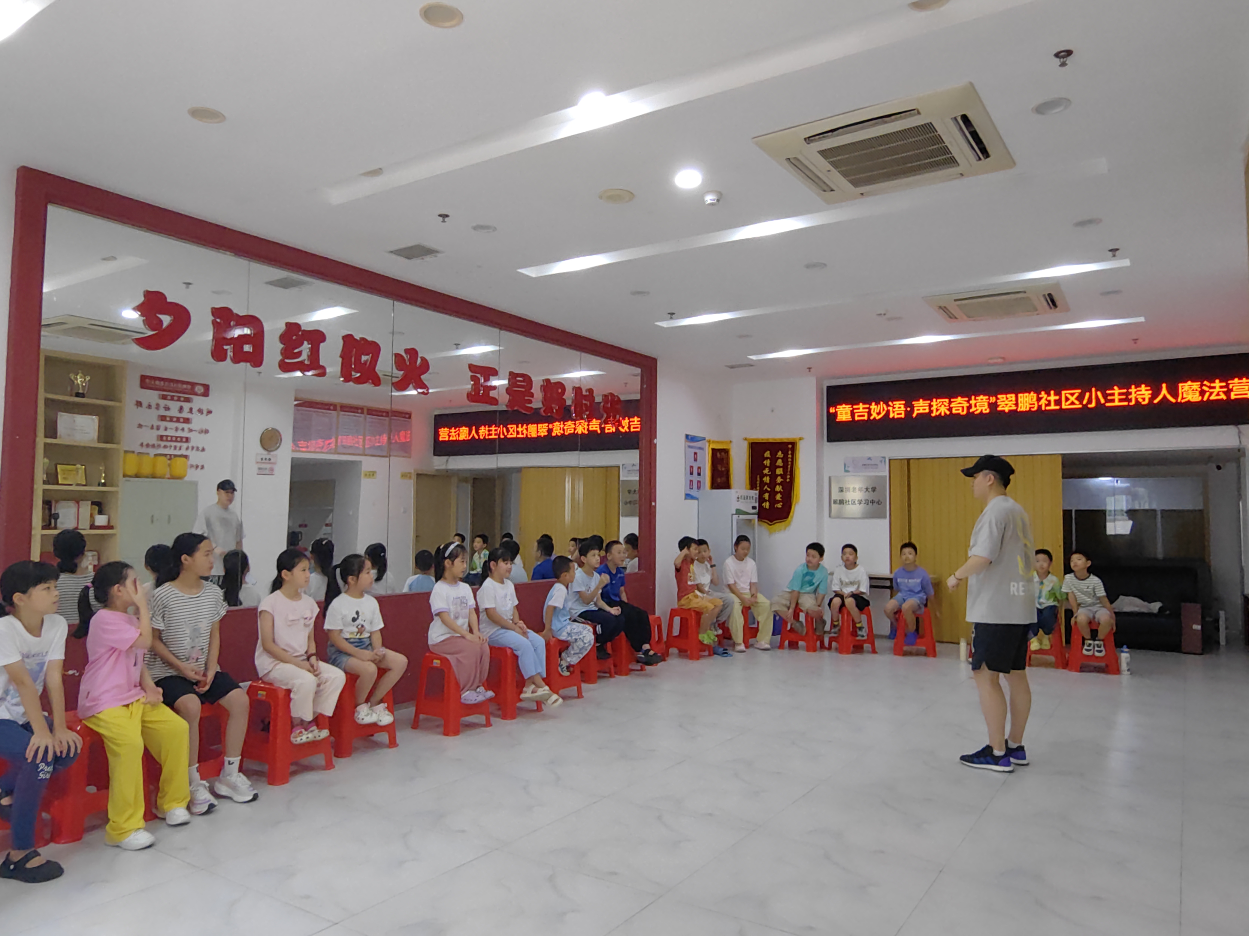 为助力社区儿童友好建设,提升儿童沟通与表达能力,增强自信心,在翠鹏社区党委的大力支持下,社联社工服务中心驻翠鹏社区党群服务中心社工联合社区妇联、新时代文明实践站,链接辖区乐仕教育公益资深讲师资源,于8月11日正式启动了“童吉妙语·声探奇境”小主持人魔法营活动。首节课程吸引了二十名儿童热情参与,开启了一场妙趣横生的语言探索之旅。