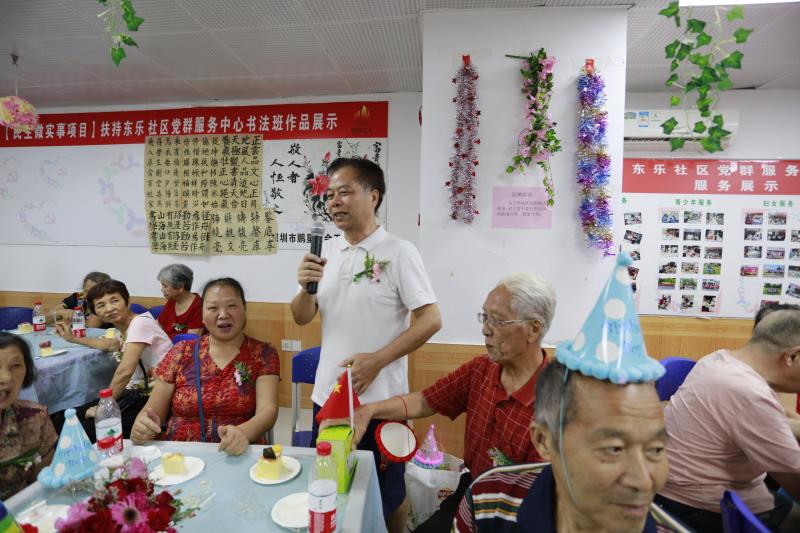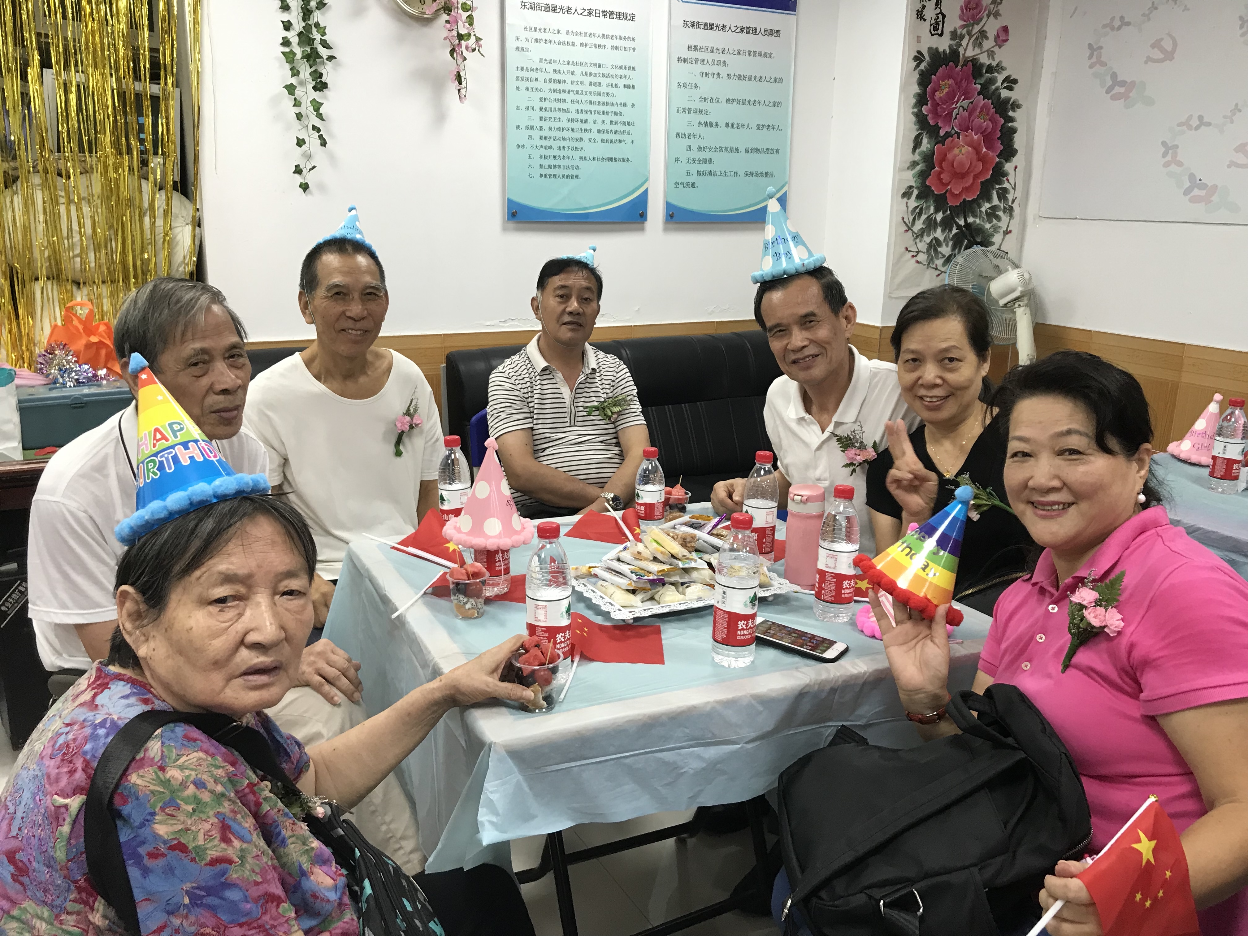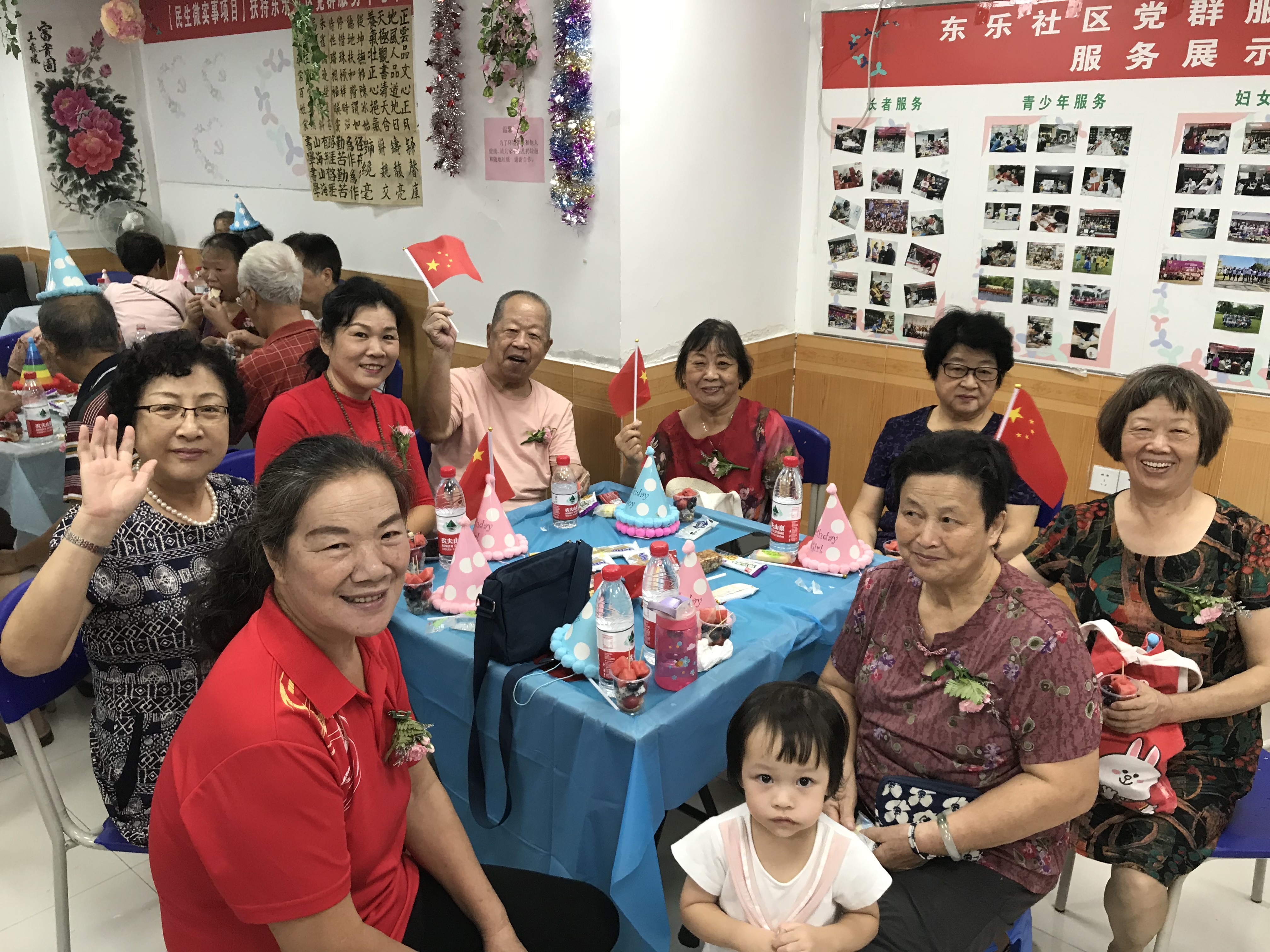 50位长者参加了本场生日会,由于临近中华人民共和国70周年华诞,能与祖国同庆,本场生日会分外喜气。东乐社区社工为下半年过生日的长者们准备了“你比我猜红歌名”等游戏,和《我们是中光荣的国人》诗朗诵,还有红歌齐唱活动。在现场自告奋勇的合唱指挥的带领下,大家齐唱《歌唱祖国》。饱含着深情的歌声和现场挥舞的国旗,把生日会气氛推向了高潮。当生日歌的旋律唱起,烛光掩映在岁月洗礼的脸庞上,祝福洋溢在每个人的心田。长者们表示能欢聚一堂,热热闹闹过生日,非常的开心,感谢党委,感谢东湖街道民生微事实项目的扶持,感谢社工和义工们的细心服务,希望每年都能参加热热闹闹的生日会!