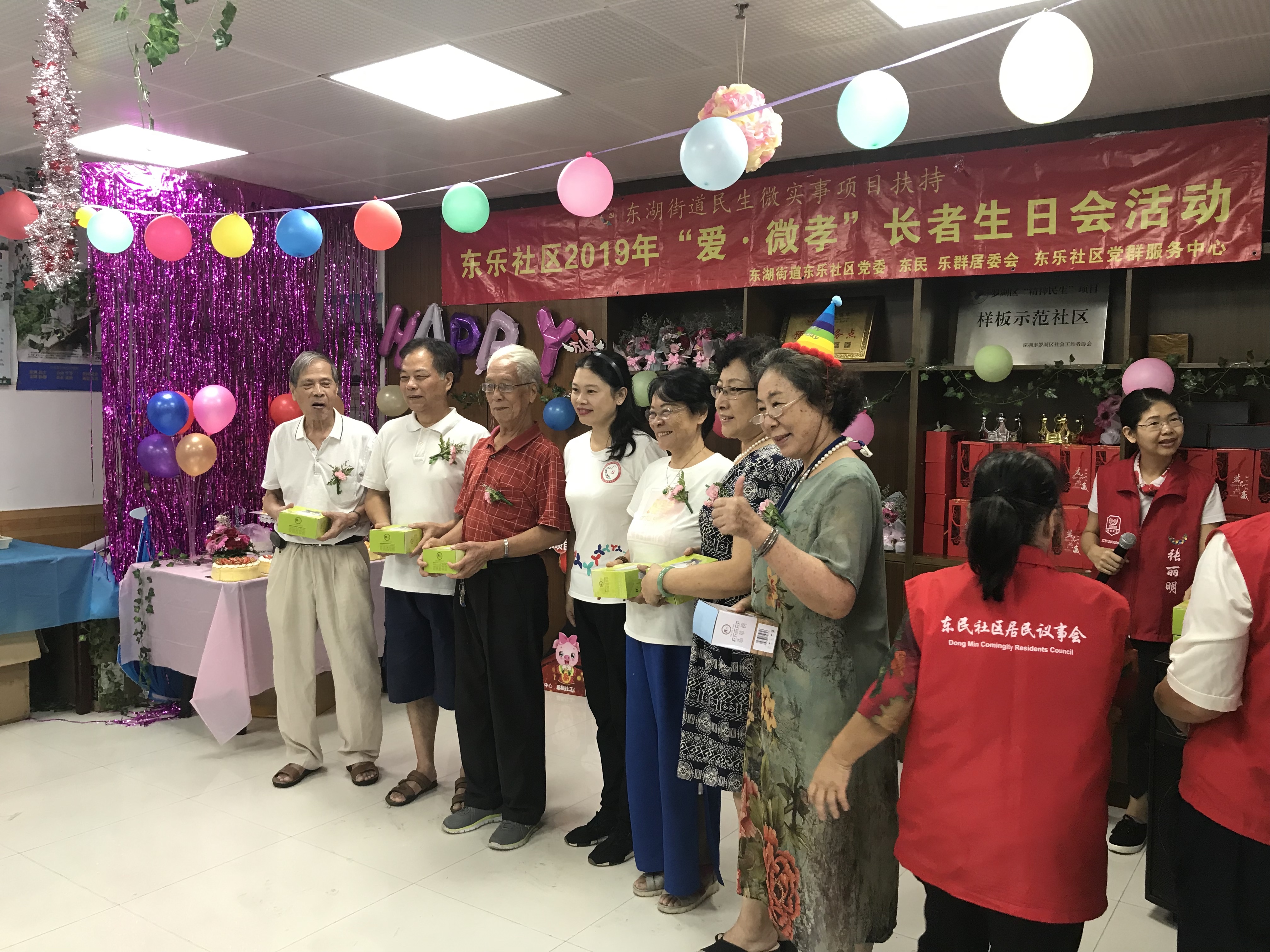 东湖街道民生微实事项目扶持的“爱·微孝”长者生日会在东乐社区已经举办二十场了,通过生日会,增进了社区老人之间的相互了解,丰富了他们的老年生活,也让社区党委对社区老人的生活情况有大概的了解,更能在活动中关心长者,向长者及时问需。期待在下次生日会能为长者们带去更多的欢声笑语。