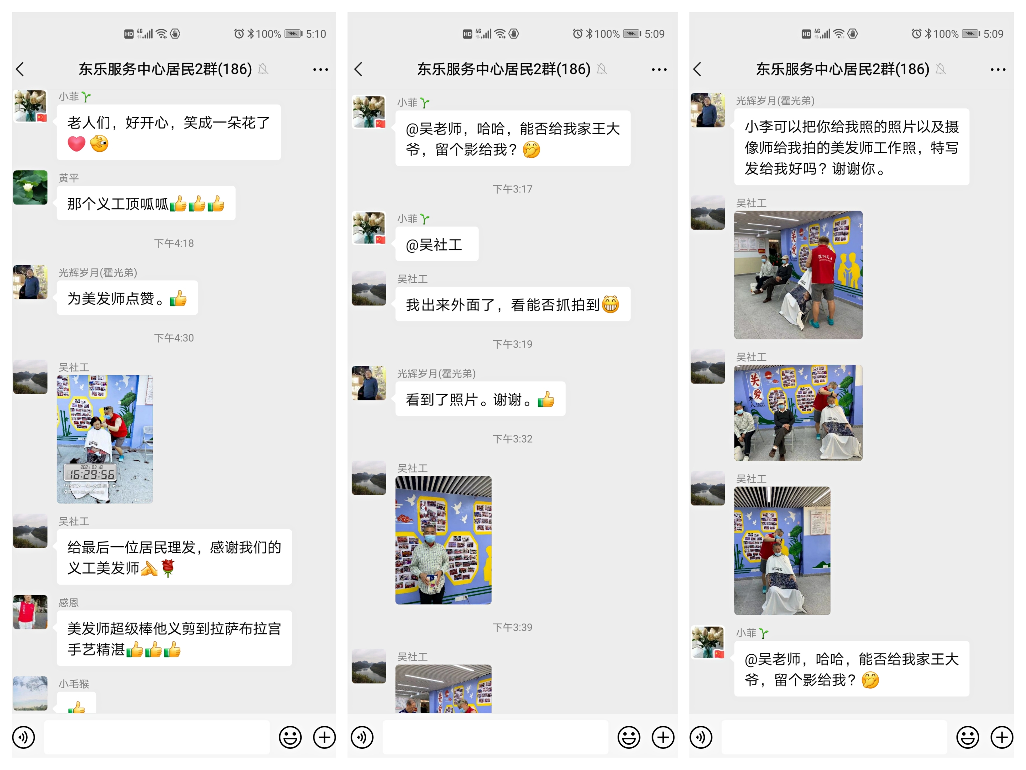 助力社区建设、促进社区和谐、改善社区居民福祉是社会工作的重要使命,东乐社工在社区党委的领导下,积极投身社区建设,在创新社区治理、回应社区居民需求、融洽社区居民关系中发挥着越来越重要作用。值此国际社工周,东乐社工在党委为民、便民、安民的工作指导下,链接鼎糧造型的张老师,为社区20名长者义剪。张老师手艺精湛,义工服务经验丰富,理发间还和大家分享了义工服务的经历,居民们在微信服务群中纷纷为义工师傅点赞。党委引领,社工链接,义工服务,居民受益,东乐社工在社工周充分践行着新时代社区建设者使命。