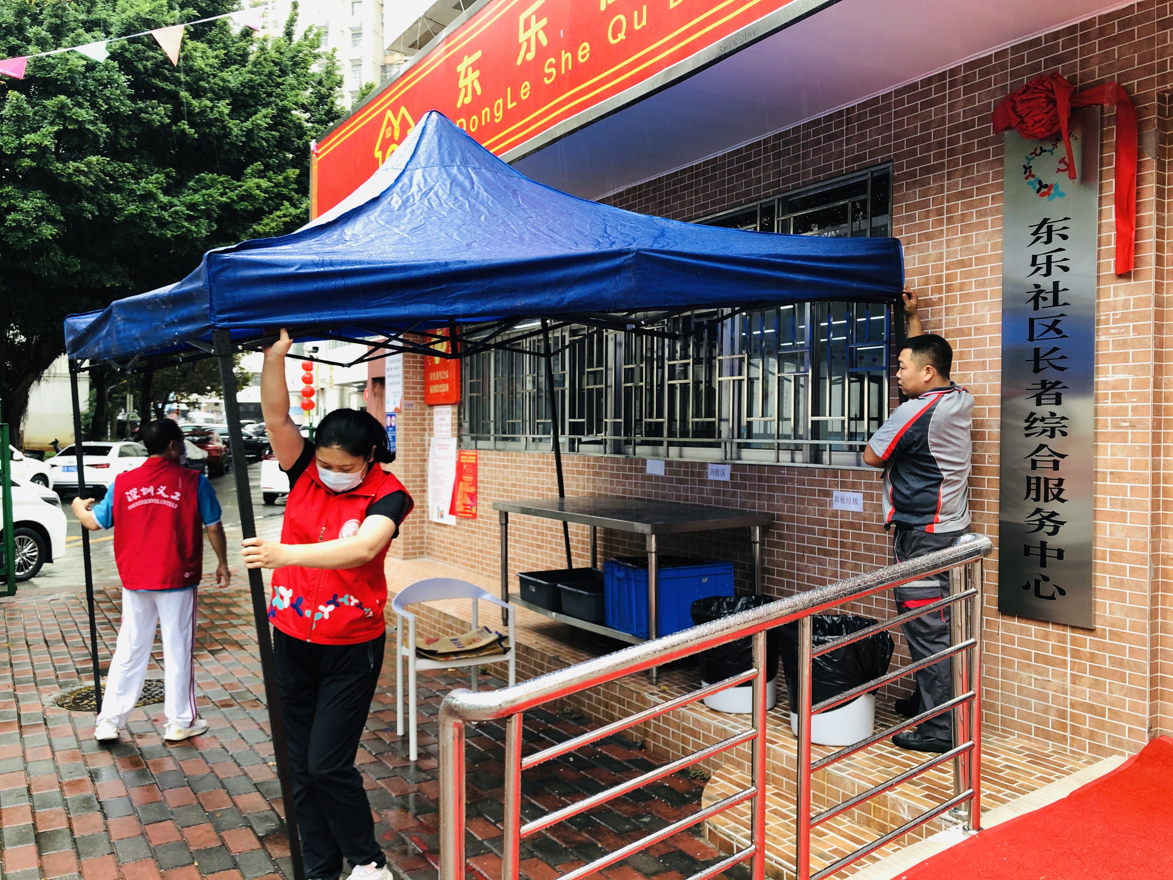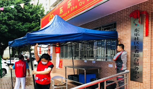 4月27日,工作人员为饭堂用餐长者撑伞支雨棚2
